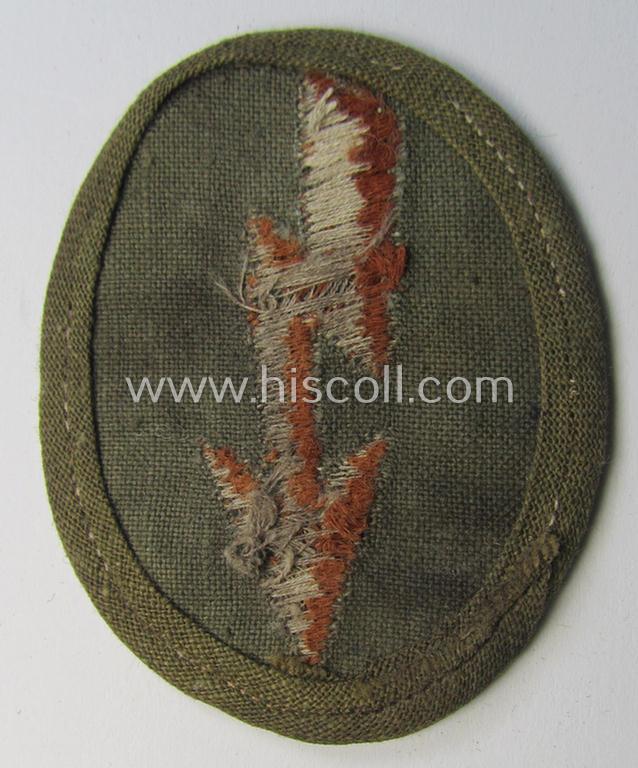 This is a neat WH (Heeres) 'tropical-styled', trade- and/or special-career insignia (or: 'Signal Blitz') as executed in machine-embroidered copper-brown- (ie. 'kupferbrauner'-) coloured linnen as was intended for usage a soldier who served within the: 'Kradschützenbtle. der Pz. Div. u. Inf. Divisione (mot.)' (or: simple soldier ie. NCO who served within one of the motorised motorcycle-reconnaissance battalions) and that comes in an overall very nice- (ie. 'virtually mint- ie. unissued'-), condition. The patch is a non-maker-marked example that shows a nicely reinforced border and additional backing: it does show some minimal age ie. staining simply caused by decades of storage only (as can be seen on the pictures). Simply a nice occasion to acquire a 'virtually mint', 'tropical-issue' ie. DAK- (or 'Deutsches Afrikakorps'-) related: 'Signal Blitz' as was intended for the: 'Kradschützenbtle. der Pz. Div. u. Inf. Divisione (mot.)'!
