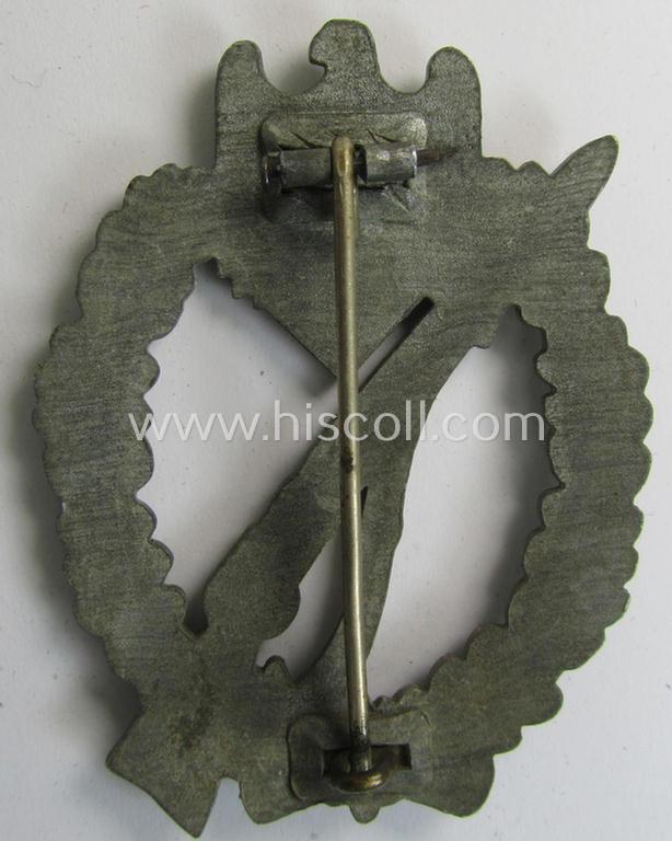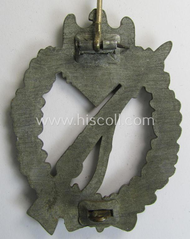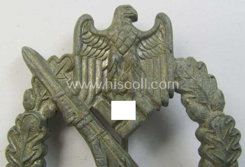 Moderately used, 'Infanterie-Sturmabzeichen in Silber' being a non-maker-marked- and/or zinc- (ie. 'Feinzink'-) based specimen of the so-called: 'pillow-crimped'-pattern (as was produced by a to date still unidentified maker)