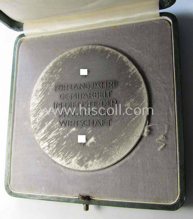 Larger-sized- and silver-toned, so-called: award-plaque (or: 'Erinnerungs- o. nichttragbare Medaille') showing 3 figures and that is entitled: 'Für langjährige Mitarbeit im Dienste der Pfälzischen Wirtschaft' and that comes stored in its period-etui