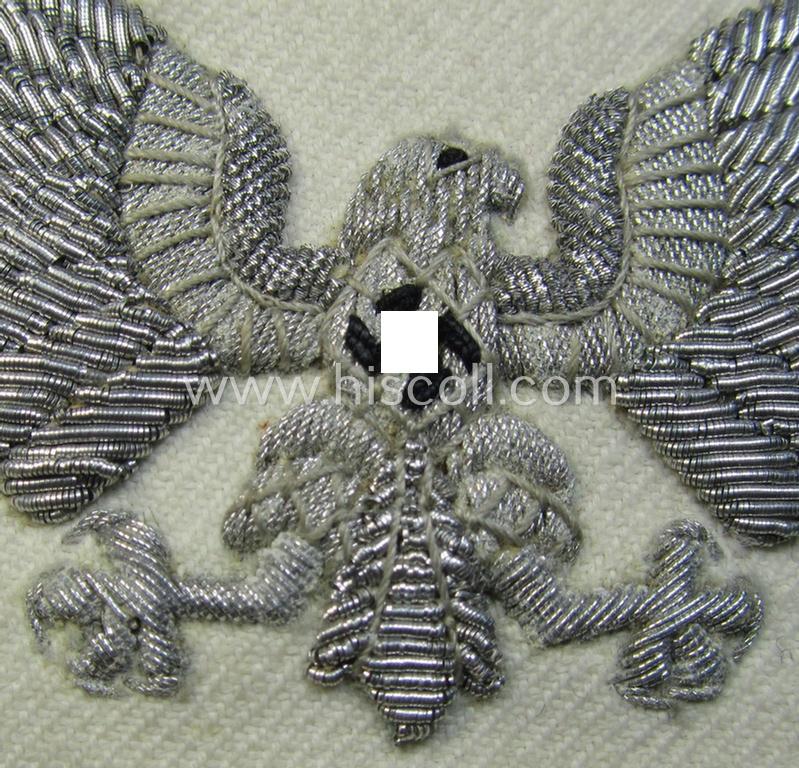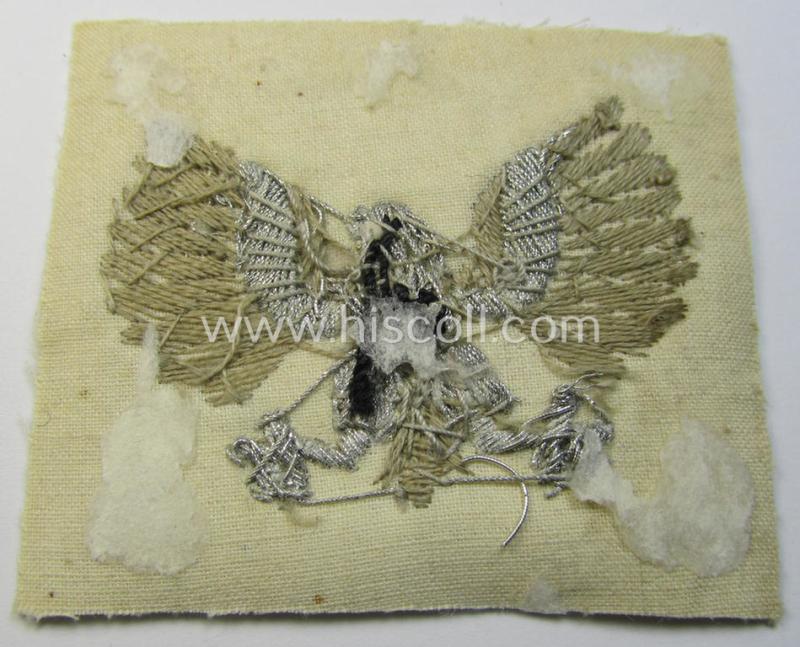 This is a very attractive - and truly rarely encountered! - so-called: (ie. 'Jungmädel' o. 'Bund Deutscher Mädel') neatly hand-embroidered, leaders-breast-badge (ie. 'Brustabzeichen o. schildförmiges Brustwappen für das weisser o. Sommer-Dienstjackett') as was intended for a leader with the rank of a: 'BDM-Gruppenführerin eines JM-Bannes' and that comes in a very nice- (ie. simply never used- nor worn- ie. 'virtually mint- ie. unissued'-), condition. The neat breastbadge - being of the second- (ie. war-time-) pattern as was introduced in 1943 - is approximately 7 x 6 cms. sized: it comes in a simply never worn nor used condition and will be very hard to be upgraded: it misses, however, its paper-based 'RzM'-etiket and has a neat 'buckram'-based 'backing' as to be expected (as can be seen on the pictures). The details and craftmenship shown on this neat female youth-badge that originates from a private house-hold are simply stunning and very pronounced. Of interest is, moreover, the fact that this deals with a generic-example: it misses a hand-embroidered 'Bann'-numeral and has never been 'cut into shape'. The piece is void of any damage or alike and will be hard to be upgraded: it does show, however, some minimal glue- ie. carton-remains caused by having been glued into an album- or scrapbook once. Simply a very attractive and unusally encountered JM/BDM-related leaders'-item that comes not that often for sale!