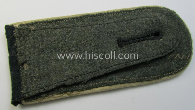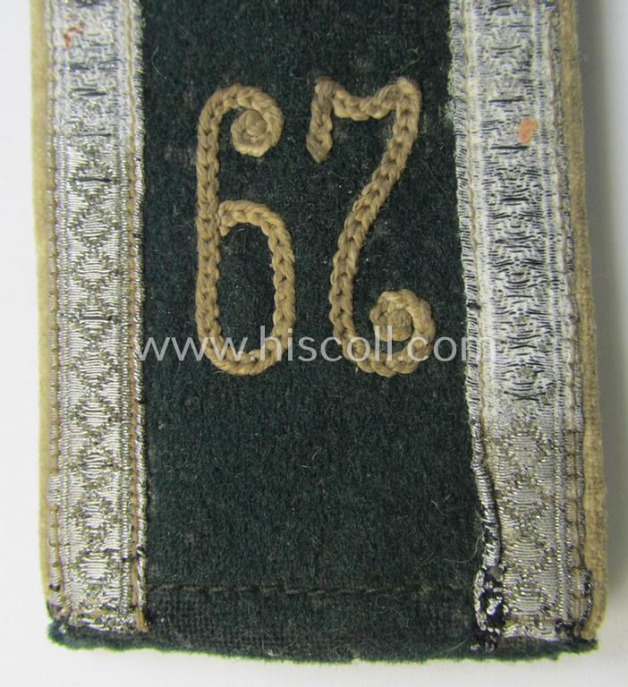 This is an attractive - albeit regrettably single albeit nevertheless scarcely encountered! - pre- (ie. early-war-) period- (ie. 'M36/M40'-pattern) 'cyphered' and rounded-styled, WH (Heeres) NCO-type shoulderstrap as piped in the neat white- (ie. 'weisser'-) coloured branchcolour as was specifically intended for usage by an: 'Unteroffizier u. Mitglied des Infanterie-Regiments 67' (or: junior-sergeant who served within the infantry-regiment, numbered: '67') and that comes in an overall very nice- (albeit moderately used ie. worn-), condition. The neat strap - which is of the pre- (ie. early-) war-period type - has the darker-green-coloured and/or woolen-based 'upperdeck' and does show as stated above the white- (ie. 'weisser'-) coloured branchcolour and/or woolen-type piping attached. The shoulderstrap shows the (typical) silver-toned NCO-braid attached and comes mounted onto its functional tongue (it measures approximately 11 cms. in length as more often). It does show the neatly machine-embroidered and white-coloured '6'- and/or '7'-cyphers (ie. numerals or: 'Ziffern') which are both executed in so-called: 'Kurbelstickerei' as to be expected (as can be seen on the pictures). The strap shows some minimal age, wear and or minimal staining (as can be seen on the pictures). It should noted that these neatly 'cyphered', 'Infanterie'-related shoulderstraps can easily be graded 'rare': too bad that it is only a single specimen!