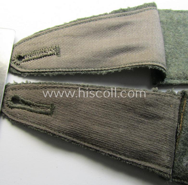 This is an attractive - minimally mis-matched but nevertheless not that easily encountered! - neatly 'cyphered'- (and I deem fairly early- (ie. mid-) war-period pattern pair of enlisted-mens'-type shoulderstraps as was specifically intended for usage on the field-grey coloured navy-style tunics by a: 'Soldat eines Küsten-Artillerie-Abteilungs' (or simple soldier who served within a naval coastal-artillery unit) and that comes in an overall very nice- (and I deem just minimally used- ie. worn-), condition. The straps - which are fully 'text-book' in all facets - measure approximately 11,1 cms. in length (and have a width of 5,5 cms. as usually seen) have the field-grey-coloured- and/or woolen-based 'upperdecks' and come mounted onto their functional tongues. The straps show the neat interwoven so-called: 'crossed-anchors'-cyphers or: 'Ziffern' (which are both executed in golden-yellow-coloured linnen) denoting the rank of simple: 'Soldat o. Maat'. The straps - shows some minimal age, wear and/or staining but are totally void of any damage (as can be seen on the pictures). It should be noted that ALL 'Küstenartillerie' insignia-pieces are actually quite hard to encounter: those 'cyphered' examples even more so, which grades them easily as 'scarce'. Simply an attractive 'cyphered', naval EM-type shoulderstrap-pair that was intended for usage on the field-grey-coloured attire!
