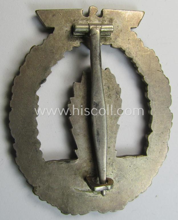 This is a very attractive - and truly 'high-quality'-produced! - example of a WH (Kriegsmarine) so-called: 'Kriegsabzeichen für Minensuch-, U-Boot-Jagd und Sicherungs-Verbände' (or: mine-sweeper war-badge) being a very detailed albeit as more often non-marked example as was executed in multi-coloured 'Buntmetall' and that was (I deem) produced by the makers (ie. 'Hersteller') or: 'O. Schickle' or: 'B.H. Mayer' and that comes in an overall very nice- (ie. just moderately used- ie. worn-), condition. The award is (I deem) a fairly early-war-period produced specimen that has retained great pronounced detail. It comes naturally mounted onto its functional (and/or neatly vertically-mounted- and/or: 'flattened'- ie. flute-shaped pin-, typical catch and/or typical pin-attachment (as can be seen on the pictures). The piece was most certainly never cleaned ie. polished and truly retains most (ie. all!) of its golden- and/or silver-coloured finish: just some regular wear and/or age is visible. I deem that this particular naval war-badge is of the so-called: 'Schickle/Mayer'-design and can as such be attributed to one of these makers. Simply a very attractive KM-war-badge that comes in just a minimally worn and/or fully untouched condition: one of the nicesy examples I ever had on offer!