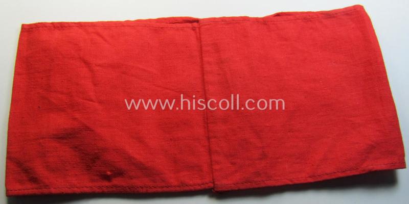 This is an attractive - and very well-preserved! - example of a bright-red-coloured- and/or linnen-based armband (ie. 'Armbinde') as was intended for usage by the: 'SA-Wehrmannschaften' being a minimally used- ie. slightly worn example that still shows its period-attached- and/or paper-based, so-called: 'RzM'-etiket and that comes in an overall very nice- (and I deem hardly worn- nor used-), condition. These decorative armbands - having a neat 'BeVo'-woven 'centered' roundel attached - were intended for specific wear on the civilian-attire but also do pictures exist were these armbands are worn on the specifically-styled- and/or brown-coloured uniforms of men attached to the so-called: 'SA-Wehrmannschaften'. The bright-red-coloured armband (as executed in bright-red coloured linnen) shows as stated above a seperately attached white-coloured 'center-piece' (depicting a golden-bronze-coloured 'SA Sportabzeichen') period-'sewn-on'. The piece on offer here - which was off-factory sewn-together - measures approx. 44 cms. by 11 cms. (as can be seen on the pictures). Simply a very attractive 'SA-Wehrmannschaften'-armband that is just minimally used!