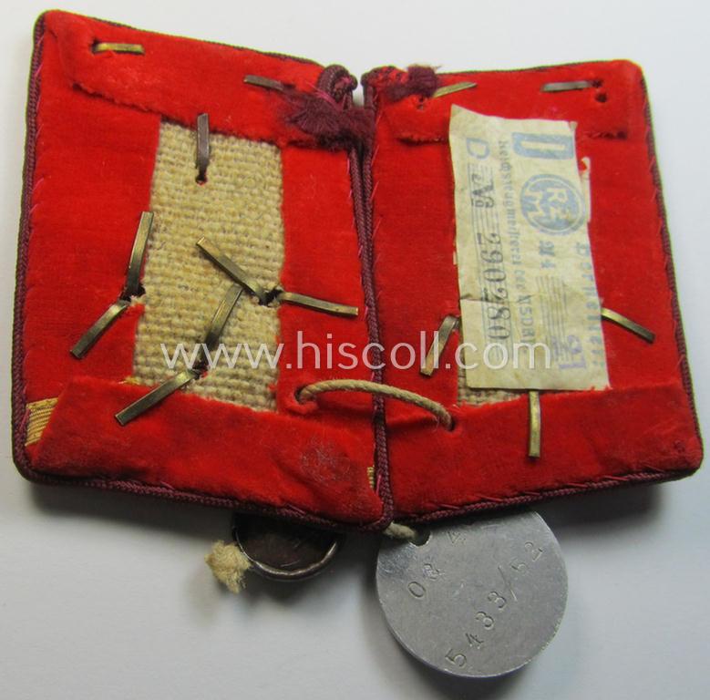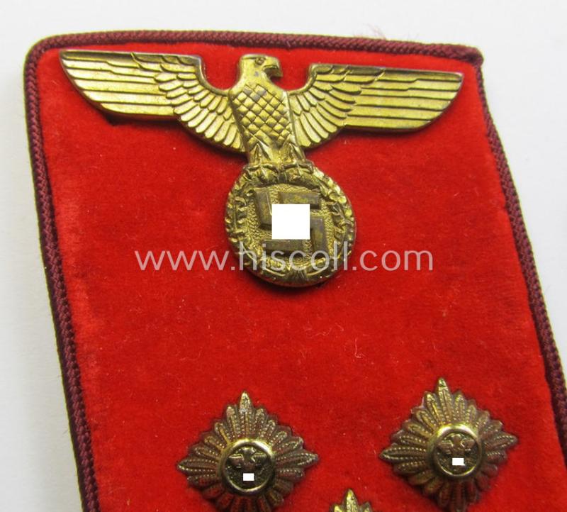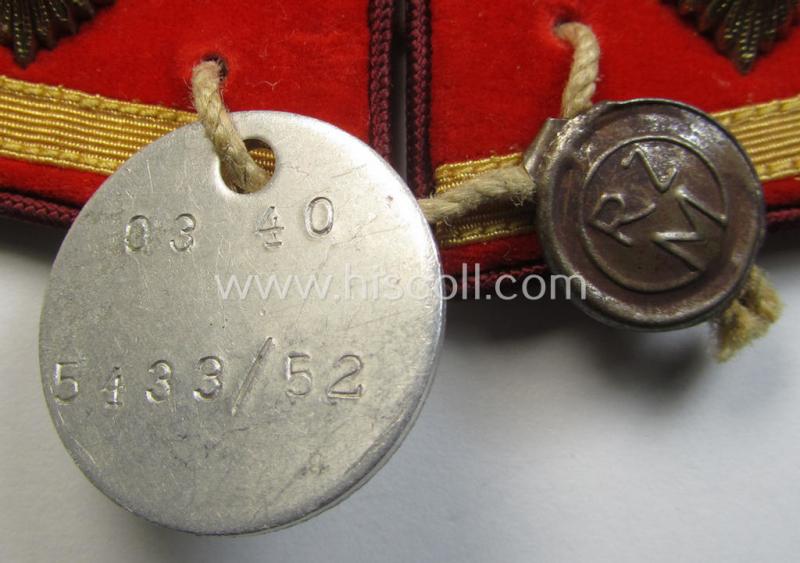 This is a very attractive - truly rarely found and fully matching! - pair of N.S.D.A.P.-type collar-patches (ie. 'Kragenspiegel für politschen Leiter') being a set as was specifically intended for usage by an: 'N.S.D.A.P.-Obereinsatzsleiter' at 'Gau'-level and that is showing a (rarely seen!) aluminium-based 'RzM-Probe'-tag period-attached and that comes in an overall very nice- (ie. simply never used- nor worn- ie. 'virtually mint- ie. unissued'-), condition. The pair is of the second pattern as was used from 1934 upto 1939 and is a set as was specifically intended for usage by an: 'N.S.D.A.P.-Obereinsatzsleiter' at 'Gau'-level: both tabs are constructed from the bright-red-coloured- and/or 'smooth-type'- (ie. typical 'velvet-type'-) cloth and both show a bright-golden-toned eagle-device, three specifically-styled pips and a single (braid-based) bar period-attached. The tabs are, moreover, piped with typical wine-red- (ie. 'bordeaux'-) coloured- and/or rayon-based piping (as always) signifying that it was intended for a party-official serving at: 'Gau'-level (being apart from the 'Reichs'-level the highest possible level in existance). The tabs are neatly backed with a piece of 'buckram'-based material and do still show a period-attached, paper-based 'RzM'-etiket in place (as can be seen on the pictures). Of course, is it of additional interest that this pair is still 'tied-together' with a piece of rope (that shows an aluminium-based 'token' bearing the engraved numerals: '03/40 5433/52' on both sides) and that is 'sealed' with a nickle-chrome-based 'RzM-seal. Simply an attractive - and actually very usually encountered! - 'Politischen Leiter der N.S.D.A.P.'-collar-tab-pair for an: 'N.S.D.A.P.-Obereinsatzsleiter' at 'Gau'-level that is not that often offered for sale and that is I deem priced according to its obvious scarcity and/or desirability!