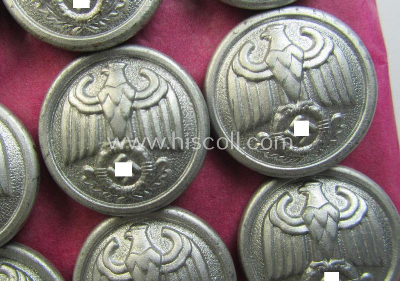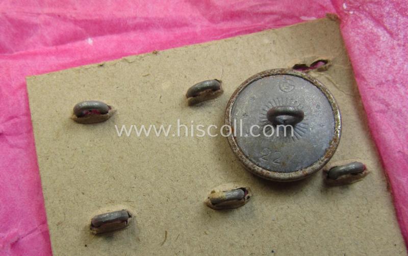 I recently found an original - and period! - carton-based 'card' holding a full set (ie. 10 pieces) of the typical bright-silver-toned and/or (I deem) zinc- ie. 'Feinzink'-based shoulderstrap-buttons (ie. 'Uniformknöpfe') showing the (typical left-facing) eagle-device as were specifically intended for usage by the various TR-period diplomatic staff-members (ie. 'Diplomatisches Korps o. Staatsbeamte') and that come all 10 in a very nice- (ie. simply never used- nor tunic-attached ie. 'virtually mint- ie. unissued'-), condition. The buttons have an approximate diameter of 2,2 cms. are all marked on their backs with the makers-designation (and logo): 'G.G - 22' (as can be seen on the pictures). The sets originated from the left-overs of an old tailor-shop and was never before in collectors'-hands and my asking-price is intended for the set compring all 10 buttons. The buttons show a truly 'shiny' surface and are void of any staining nor wear: they are just a bit stained on their backs (as can be seen on the pictures). Simply a nice occasion to acquire a 100% original - and scarcely found! - 'Diplomatisches Korps o. Staatsbeamte'-uniform-accessory for an interesting price!