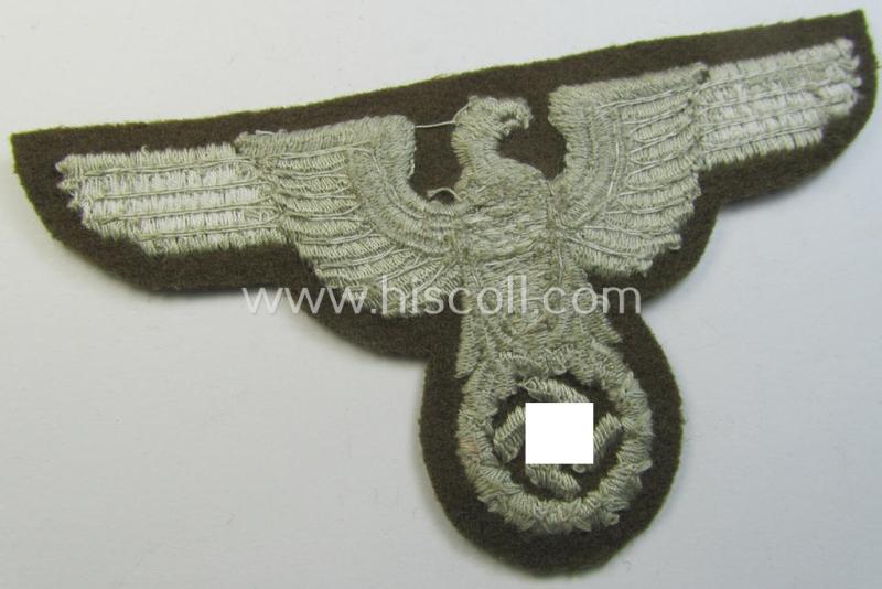 This is an attractive - and actually quite scarcely found! - machine-embroidered arm-eagle (ie. 'Ärmeladler für Beambten des Reichsministerium für besetzte Ostgebiete') as was specifically intended for usage on the typical brownish-green-coloured tunics of officials belonging to the: 'Reichsministerium für besetzte Ostgebiete' (ie. 'R.M.b.O.') and that comes in an overall very nice- (I deem simply never used- nor worn ie. 'virtually mint'), condition. This example - having a 'wingspan' of approximately 11 cms. as more often - is nicely machine-embroidered using greyish-silver-toned braid on a (typical) brownish-green-coloured- (and/or: woolen-based-) background (as can be seen on the pictures). This example was - I deem - simply never used- and does show some obvious storage-age only (as can be seen on the pictures). Simply an attractive - and actually not that often seen! - example of a so-called: 'R.M.b.O.'-armeagle that can naturally easily be attached to any 'R.M.b.O.'-tunic or to be simply kept in any eagles'-collection!