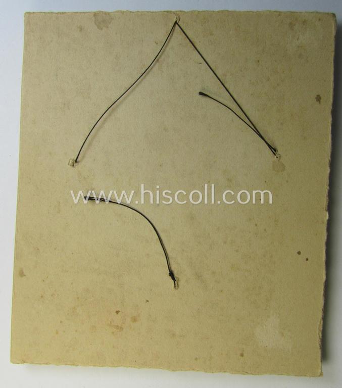 This an attractive - and with certainty unusually found! - example of a a neatly hand-embroidered, WH (Kriegsmarine) trade- ie. special-career-patch (ie. 'Tätigkeitsabzeichen') as was intended for usage onto the darker-blue-coloured navy attire as was specifically intended for usage by a student who followed an eduction named: 'Elektrotechniklehrgang III' and that comes as period-attached on a piece of an explanatory carton-based card) and that comes in an overall very nice- (and as stated above simply never used- ie. 'virtually mint- ie. unissued'- and or/never tunic-attached-), condition. The badge - which has an additional linnen-based 'backing' attached - signified that the bearer had sucessfully succeeded various tests in this speciality. The piece is very nicely hand-embroidered (in reddish-toned linnen) onto a typically darker-blue-coloured- and/or woolen-based background and simply shows no age nor wear (just some minimal storage-age ie. staining is present and visible). Of interest is, moreover, the fact that this specimen (as well as the three other similar KM trade-insignia on offer on my web-site) was carefully 'cut-out' of a larger-shaped and/or carton-based (instruction?) board and shows a period-inked (ie. hand-written) description (as can be seen on the pictures). Simply a very attractive - and truly unusually found! - Kriegsmarine-'Tätigkeits-Abzeichen' that is with certainty accordingly priced!