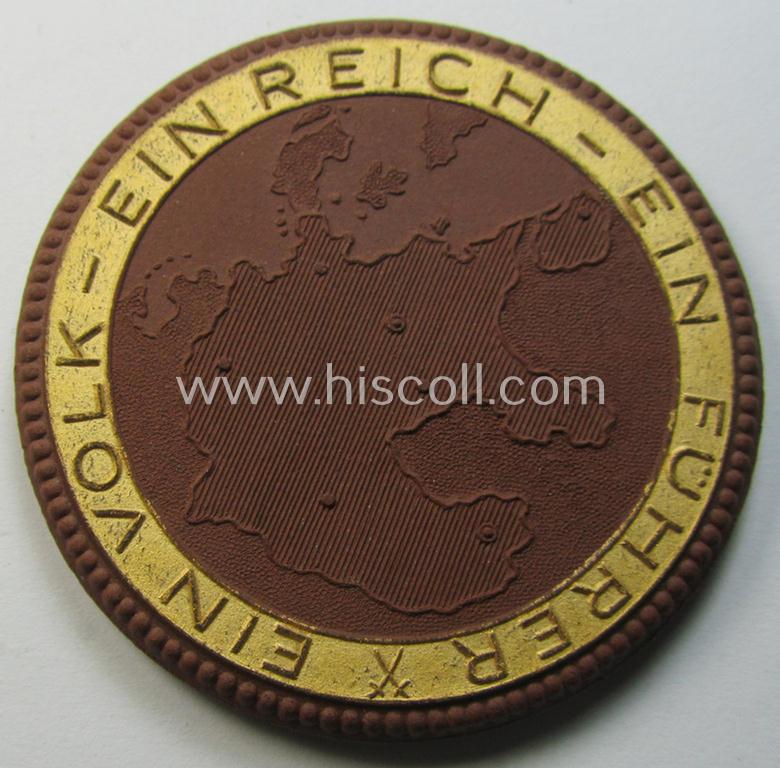 This is an attractive - and with certainty not that often encountered! - brownish-red-toned- and/or: 'Meissen'-porcelain-based, so-called: commemorative-plaque (ie. 'Erinnerungs- o. nichttragbare Medaille') showing on its front two shaking hands (and double swastika-signs!) and bearing the text: 'Zur Erinnerung - 13. März/10. April - 1938' and on its back a map of Europe coupled with the text: 'Ein Volk - Ein Reich - Ein Führer' and that comes in an overall very nice- (and I deem most certainly issued- ie. awarded-), condition. The neat - medium-sized piece having an approximate diameter of approximately 5,4 cms. - has very pronounced detail and was never cleaned nor polished: it has maintained a typical age-patina and is very detailed and/or pronounced (but also shows some regular tarnish as can be seen on the pictures). These neat - and I deem semi-official - presentation-pieces (which are sometimes referred to as: 'Böttger-Medaillen' after its initital designer) were used as some sort of commemorative-awards. The piece originates from a private-household in Germany where it was recently uncovered as issued and stored for decades. The plaque bears a clear makers'-designation ie. Meissen-logo ie. two crossed swords (as can be seen on the pictures). It should be noted that this (fragile) piece is really nicely preserved and is totally void of any damage and shows a fully preserved golden-tone rim (as can be seen on the pictures). Simply an attractive - and with certainty unusually encountered! - 'Meissen-Porzellan'-based table-medal ie. 'Erinnerungs- o. nichttragbare Medaille' that is entitled: 'Zur Erinnerung - 13. März/10. April - 1938'!