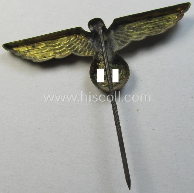 This is a neat - and actually fairly scarcely encountered! - example of a bright-golden-toned WH (Kriegsmarine) so-called: 'single-pattern'-eagle-pin being a non-marked example as was specifically intended for attachment onto the (darker-blue- ie. white-topped-) so-called: Kriegsmarine-related: 'Tellermützen' and that comes in an overall nice- (albeit clearly used- ie. most certainly once cap-attached-), condition. The piece on offer here is the so-called: 'one-pieced'-model, showing a bright-golden-toned, copper-based eagle-device without attached cocarde. The piece was clearly used ie. worn but nevertheless retains most of its bright golden-toned finish: it is a piece that is neatly: 'feuervergoldet'. The eagle-pin was - I deem - never cleaned and comes as recently found (it does show some minimal staining). The piece is somewhat converse-shaped as more often encountered and comes of course mounted onto its original, full-sized, pin. Simply a nice and/or fairly scarcely encountered naval replacement-piece that is accordingly priced!