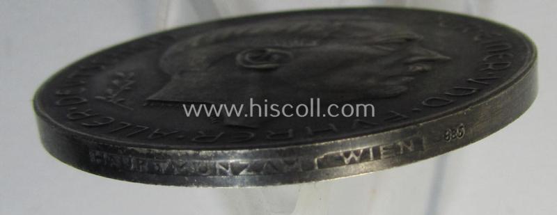 This is an attractive - and with certainty not that often- ie. most certainly scarcely encountered! - silver-toned- (and I deem genuine silver-based!) so-called: commemorative-plaque (ie. 'Erinnerungs- o. nichttragbare Medaille') showing a detailed portrait of Adolf Hitler on its front and bearing the text: 'Der einer und Führer aller Deutschen' and on its back the text: 'Das Grossdeutsche Reich ist erstanden - 13.-3-1938 – 29.-9-1938' and that comes in an overall wonderful and truly nicely preserved, condition. The neat - medium-sized- and/or regular-weight-piece having an approximate diameter of 3,7 cms. - has truly pronounced detail and was I deem never cleaned nor polished: it has maintained a neat silver-toned age-patina (but also shows some minimal tarnish - see pictures). The piece shows a silver-content-mark ('935') and shows a clear makers'-designation on the rim (that reads: 'Hauptmünzamt Wien'). These neat - semi-official - presentation-pieces were I deem used as some sort of awards as (presumably) handed-out at party-related gatherings or alike. The piece originates from a private-household in Germany where it was recently uncovered as issued and stored for decades (see pictures). Simply a very attractive - and with certainty unusually encountered! - table-medal ie. 'Erinnerungs- o. nichttragbare Medaille' that might merit some further investigative work!