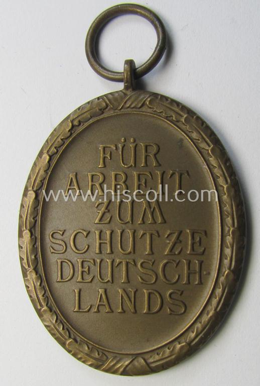 Medal-set: 'Deutsches Schutzwall Ehrenzeichen' (aka: 'Westwall'-medal) being a non-maker-marked- and/or: 'Buntmetall'-based specimen that comes together with its period- (and neatly folded ie. pre-confectioned) ribbon (ie. 'Bandabschnitt')