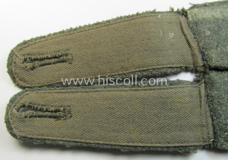 This is an attractive - fully matching and actually not that easily found! - pair of WH (Heeres) - I deem - early- (ie. mid-) war-period (ie. 'M41/M43'-pattern) NCO-type shoulderstraps as piped in the darker-blue- (ie. 'blauer'-) coloured branchcolour as was intended for an NCO (ie. 'Unteroffizier' or: junior-sergeant ie. medical-orderly) who served within a: 'Heeres Sanitäts-Abteilung' and that comes in an overall very nice- (albeit moderately used ie. worn- and/or most certainly once tunic-attached-), condition. The neat straps are just moderately used and/or worn and do show some minimal wear, age and/or staining but are void of any damage or alike (as can be seen on the pictures). The straps show the desirable darker-blue- (ie. 'blauer'-) coloured- and/or 'silk-like'-type piping and measure approximately 11,9 cms. in length each. The pieces show the 'standard'-pattern (somewhat sub-dued) silverish-grey-coloured, NCO-braid period-attached (by hand-stitching!) and come naturally mounted onto their functional tongues (as can be seen on the pictures). The pair is constructed from the typical field-grey-coloured wool and is with certainty a: 'standard-issued'- (ie. non-tailor-made) pair. These type of shoulderstraps are of the typical early- ie. mid-war-period pattern straps and were worn in the period around 1941/1943 (and were 'worn-out' even during the rest of the war). This particular pair originated from a larger cloth- ie. shoulderstrap-collection I recently acquired for the web-site. Simply an attractive - and with certainty desirable! - 'Sanitäter'-related NCO-type 'Heeres' shoulderstrap-pair: I deem that I priced this attractive pair according to its overall very nice and totally untouched condition!
