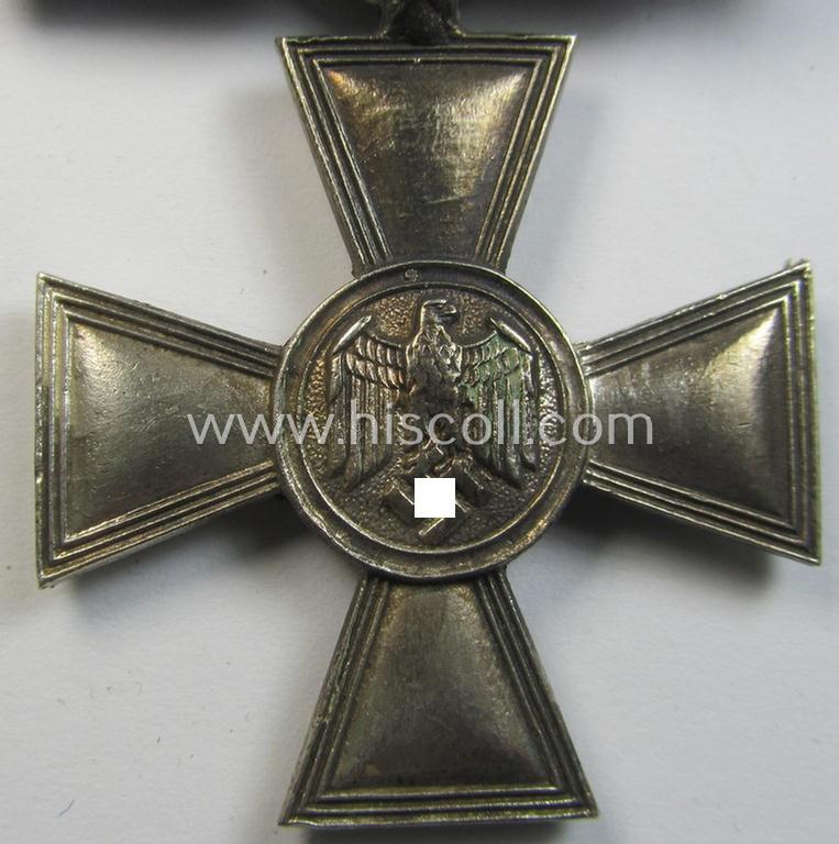 This is a truly attractive - and I deem just moderately used- and/or worn! - example of a (bright!) silver-toned WH (Heeres o. KM) so-called: 'Einzelspange' (being of the desirable detachable-pattern!) showing a: 'WH-Dienstauszeichnung 2. Stufe' (as was intended for 18 years of service) that has a neat and pronounced (regular-sized) WH (Heeres o. KM) eagle-device period-attached and that comes with its accompanying, single-pieced ribbon-bar (ie. 'Feld- o. Bandspange') and that come both in an overall nicely preserved- albeit moderately used- and/or worn condition. The detailed: 'WH-Dienstauszeichnung 2. Stufe' (as was intended for 18 years of loyal-service) comes mounted onto its confectioned, darker-blue- (ie. cornflower-blue-) coloured ribbon (ie. plate) as issued. The detail on this example is simply extraordinary: it has - I deem - never been cleaned nor polished and has a very attractive and just minimally tarnished) age-patina. The medal is 'mounted' onto a clasp (with functional pin/catch-set-up) as was intended for wearing this example on a 'going-out'- ie. dress-tunic or 'Waffenrock'. This example truly retains gorgeous details and has a great age-patina: it retains all of its somewhat 'frosted'- and/or: silver-toned finish without showing any defaults. The piece is not 'backed' but comes mounted onto a chrome-based backing-plate as is more often seen (as can be seen on the pictures). The darker-blue-coloured ribbon shows only minimal usage and/or staining. Simply a very attractive WH (Heeres o. Kriegsmarine) example of a higher-class 'WH-Dienstauszeichnung' that comes mounted as an: 'Einzelspange'!