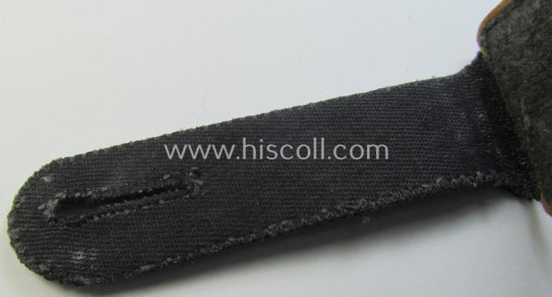 This is an attractive - albeit regrettably single! - Waffen-SS, enlisted-mens'-type shoulderstrap as piped in the golden-yellow-coloured branchcolour as was intended for usage by a soldier who served within the: 'Waffen-SS Kavallerie o. Aufklärungs-Truppen' (ie. SS-reconnaisance- or: cavalry-troops) and that comes in an overall nice- (albeit just moderately used- ie. worn-), condition. The shoulderstrap has the typical Waffen-SS-pattern- and/or: smaller-shaped tongue attached as only observed on genuine Waffen-SS-pattern straps and has the neat golden-yellow- (ie. 'goldgelbener'-) coloured branchcolour and/or 'silk-like'-type branchcolour (ie. piping) attached (as can be noticed on the pictures). The shoulderstrap - which is 11 cms. sized in length as more often encountered - shows the field-grey-coloured- and/or: woolen-based 'underlay' (as can be seen on the pictures). The piece shows some minimal age and/or staining simply caused by minimal wear and/or age. In any case is this a fully garuanteed, 100% original Waffen-SS shoulderstrap that comes in a wonderful condition and that is consequently priced. The strap shows hardly any wear nor damage and is as stated only slightly used ie. worn. It should be noted that these original, period Waffen-SS shoulderstraps can easily be graded 'scarce': even more so when they are piped in the desirable, golden-yellow-coloured- (ie. 'Waffen-SS Kavallerie o. Aufklärungs-Truppen'- or: SS-reconnaisance- ie. cavalry-troops-related-) branchcolour: too bad that it is only a single specimen!