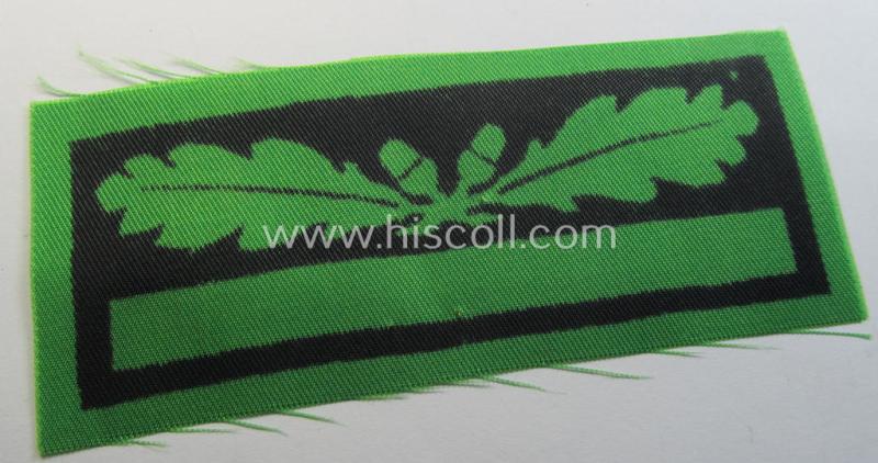 This is an attractive - albeit regrettably single! - officers'-pattern, WH (Heeres o. Waffen-SS) rank-insignia-bar (ie. 'Rangabzeichen für die Tarnuniform') as was intended for usage on the various camouflaged-uniforms by a junior-ranked officer holding the rank of 'Leutnant' (ie.: 'SS Untersturmführer') being a typical, printed example as executed on typical silk-like material (ie. 'Kunstseide') and that comes in an overall very nice- (ie. never used- ie. 'virtually mint- ie. unissued'-), condition. The piece - which is of the 'printed pattern' as executed in black on a bright-green-coloured and/or 'silk-like'-type, linnen-based background - shows a single oakleaf-bar and square-sized rank-bar signifying that it was intended for usage by a junior-officer with the rank of: 'Leutnant' (ie.: 'SS Untersturmführer'). The piece is just a tiny bit stained caused by decades of storage but is simply nicely preserved over the years (as can be seen on the pictures). Simply an attractive - and actually not that often encountered! - WH (Heeres o. Waffen-SS) rank-insignia-bar that is with certainty accordingly priced: too bad that it is only a single specimen!