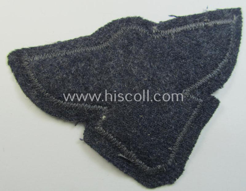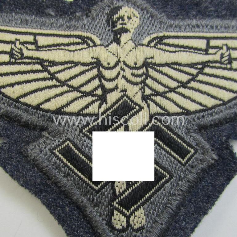 This is a very attractive - and actually not that easily found! - example of a bluish-grey-coloured, so-called: N.S.F.K.- (or: 'National Socialistisches Flieger Korps') breast-eagle ('Armadler für Mannschaften u. Unteroffiziere des N.S.F.K.') being a nicely ('BeVo'-) woven- (and enlisted-mens'- ie. NCO-pattern) example depicting the 'Fliegender Mensch'-symbol that comes (pre)mounted on its piece of bluish-coloured wool and that comes in an overall very nice- (ie. moderately used- ie. once shirt- ie. tunic-attached-), condition. The breast-eagle - which is neatly woven in the so-called: 'BeVo'-like weave-technique - comes (off-factory) mounted on its bluish-coloured- and/or woolen based backing but misses an 'RzM'-etiket (as can be seen on the pictures). The piece was minimally used ie. presumably once tunic-(ie. shirt-) attached and does show some minimal signs of having been worn and used as such (as can be seen on the pictures). Simply an attractive EM- ie. NCO-pattern example that was specifically intended for usage on the bluish-coloured: 'N.S.F.K.-Dienstblusen' (ie. shirts or tunics)!