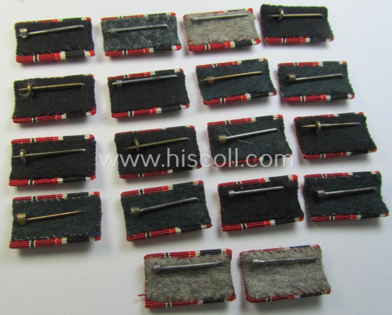I recently uncovered a small batch of two-pieced, (genuine) WWII-period ribbon-bars (ie. 'Feld- o. Bandspangen') that each depict the combination: 'Kriegsverdienstkreuz der II. Klasse mit Schwertern' (or: war merits'-cross second class with swords having a bronze-toned swords-device attached) and an: 'Ost'-medal (ie. 'Medaille Winterschlacht im Osten 1941-42') and that come all in an overall very nice- (and simply never issued- nor worn-), condition. The pieces - which originated from the 'left-overs' of an old tailor-shop - are 'standard-issue'-pattern, two-pieced ribbon-bars (ie. 'Feld- o. Bandspangen') of which both bars are of the smaller (ie. regular 1,5 cm. wide-sized-) version: all pieces measure thus 3 cms. in length. The pieces are all neatly 'backed' with a piece of darker-greenish- ie. field-grey-coloured wool as to be expected. The bars come in an overall very nice condition and are naturally fully functional: they just show some minimal storage-age ie. staining (as can be seen on the pictures). My asking-price is naturally intended per single 'Feld- o. Bandspange'. Please do note that this item does not show 'reserved' before the last item has been sold. Simply a nice opportunity to acquire a neat 2-pieced ribbon-bar that can be used for almost every TR-tunic!