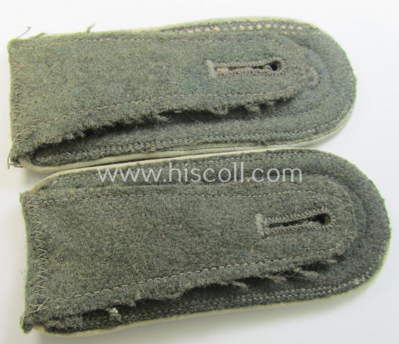 This is a truly very attractive - and/or fully matching! - pair of 'standard-issued' WH (Heeres), early- (ie. mid-) war-period- (ie. 'M41/M43'-) -pattern NCO-type shoulderstraps as piped in the white- (ie. 'weisser'-) coloured branchcolour as was intended for - and clearly worn by! - a: 'Feldwebel eines Infanterie-Regiments' (or: NCO ie. sergeant who served within an infantry-regiment ie. unit) and that comes in an overall nice- (ie. clearly used- ie. worn- and/or tunic-removed-), condition. The straps - which are both approximately 10,6cms. sized in length - have the 'standard-pattern' and/or: field-grey-coloured, woolen-based 'upperdecks' and have as stated above the desirable 'silk-like'-type- and/or white- (ie. 'weisser'-) coloured branchcolour ie. piping attached (as can be seen on the pictures). The shoulderstraps show the ('standard'-issue-pattern) bluish-grey-coloured (and neatly 'sub-dued') NCO-braid attached and have each a (regular-sized- and aluminium-based) pip, period-attached denoting that the pair was intended for an NCO holding the rank of: 'Feldwebel'. Both devices were with certainty period-attached and do show some regular age and/or tarnish. The pair comes mounted onto its original tongues and does just show some moderate age, wear and/or staining (as can be seen on the pictures). Simply a very attractive early- (ie. mid-) war-period, 'Heeres' NCO-type, 'Infanterie'-related shoulderstrap-pair that belonged to a: 'Feldwebel eines Infanterie-Regiments': I deem that I have priced this attractive pair accordingly!