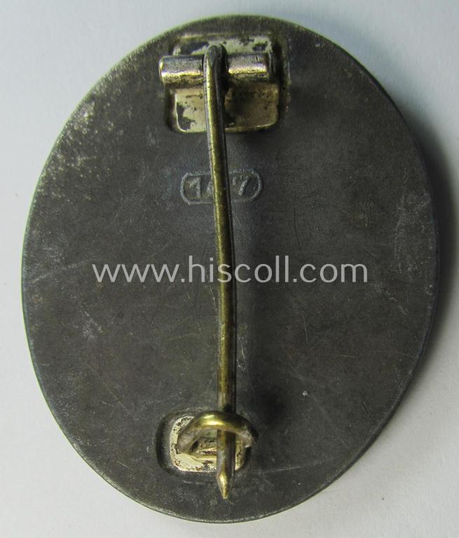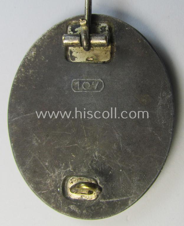 This is a neat - albeit moderately used- and/or worn - example of a silver-class wound-badge (or: 'Verwundeten Abzeichen in Silber') which is nicely maker-marked on its back (as more often) with the superimposed makers'-designation: '107' (signifying that it is a piece that was produced by the company: 'Carl Wild' as based in the town of Hamburg) and that comes in an overall nice- (albeit moderately used ie. worn-), condition. The badge - which is executed in (typical) silverish-grey-coloured- and/or typical zinc-based metal (ie. 'Feinzink') - shows some obvious - albeit wear ie. age and has a correct - and/or fully functional! - (semi-sunken!) pin- and/or catch (-set-up) in place. The badge has, however, never been cleaned and shows evident tarnish and/or wear: it has lost, however, most of its silver-toned finish as more often (as can be seen on the pictures). Still an attractive and nicely maker-marked silver-class WB that is with certainty accordingly priced!