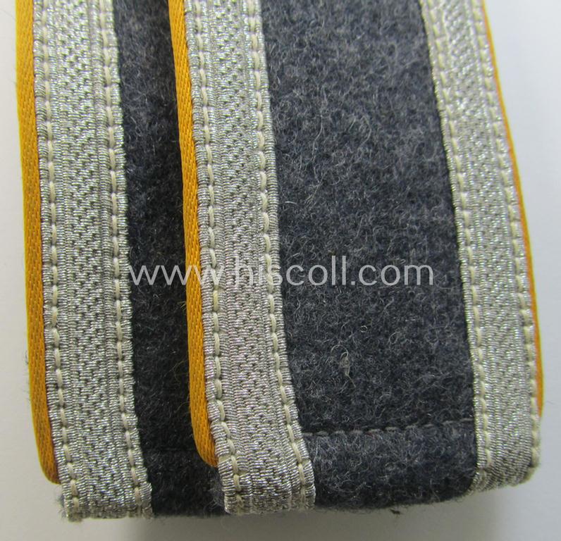 This is a very attractive - and I deem hardly used nor worn! - pair of mid- (ie. later-) war-period, 'standard-issued', WH (Luftwaffe) NCO-type shoulderstraps as piped in the golden-yellow- (ie. 'goldgelbener'-) coloured branchcolour as was specifically intended for usage by an: 'Unteroffizier der Flieger o. Fallschirm-Truppen' (or: junior-NCO ie. junior-sergeant who served within the pilots'- or paratroopers'-branch) and that comes in an overall very nice- (ie. I deem hardly used- nor worn-), condition. The neat shoulderstraps - which measure approximately 11,7 cms. in length each as more often seen - have the neat, golden-yellow- (ie. 'goldgelbener'-) coloured and/or desirable 'silk-like'-type piping attached (as is more encountered with these mid- ie. later-war-period shoulderstraps). The straps - which just show minimal age, wear- and/or staining - do show the 'standard'-issue- (ie. LW-pattern, silverish-coloured) NCO-braid period-attached and came with a pair of (smaller-sized, blue-coloured and typical pebbled-style) buttons attached (as can be seen on the pictures). It should be noted that these Luftwaffe NCO-type straps are actually quite hard to find and can easily be graded 'scarce': even more so when they are piped in the desirable, golden-yellow- (ie. 'goldgelbener'-) coloured branchcolour. Simply a very attractive - and/or fully 'text-book' NCO-type 'Flieger o. Fallschirm-Truppen'-pair that was intended for usage by an: 'Unteroffizier der Flieger o. Fallschirm-Truppen'!