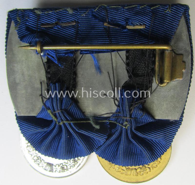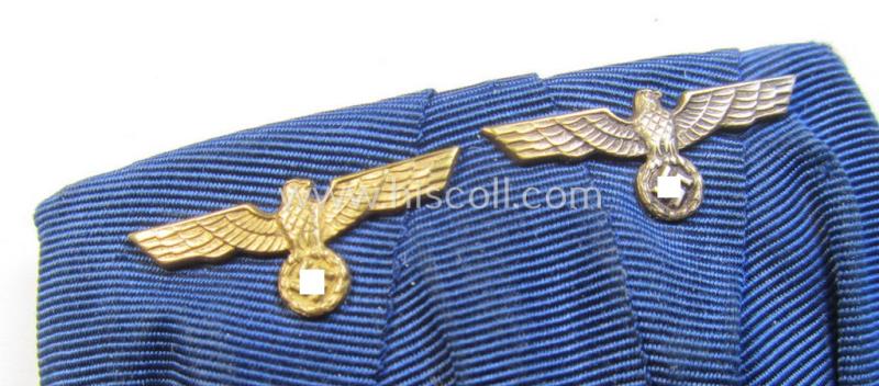 This is an attractive - albeit I deem moderately used- and/or worn - example of a two-pieced WH (Heeres o. Kriegsmarine) medal-bar (ie. 'Spange') showing respectively a: WH (Heeres o. Kriegsmarine) so-called: 'Dienstauszeichnung für 4 Jahre Treue Dienste' (or: loyal-service medal for four years of loyal service) and a: WH (Heeres o. Kriegsmarine) so-called: 'Dienstauszeichnung für 12 Jahre Treue Dienste' (or: or loyal-service medal for 12 years of loyal service) both examples having a detailed silver- (ie. golden-) coloured eagle-device period-attached and that both come in an overall nice- (albeit moderately used- ie. worn-), condition. Both medals are nicely preserved examples that seem to have never been cleaned nor polished: both come in an equally tarnished- ie. dusty condition and also come mounted on their period-attached ribbons. Both 'DA' have a neat somewhat 'frosted' appearance and show a mininally darkened age-patina (as can seen on the pictures): something that is also valid for both eagle-devices. The 'Spange' comes period-mounted as a so-called: 'Doppelspange' and is (unusually!) not 'backed' with a piece of wool. The piece retains a (still functional) pin-ie. catch set-up as to be expected. Simply an attractive and most certainly desirable example of a: 'WH-Doppelspange' that can be mounted on almost any (Heeres o. Kriegsmarine) tunic!