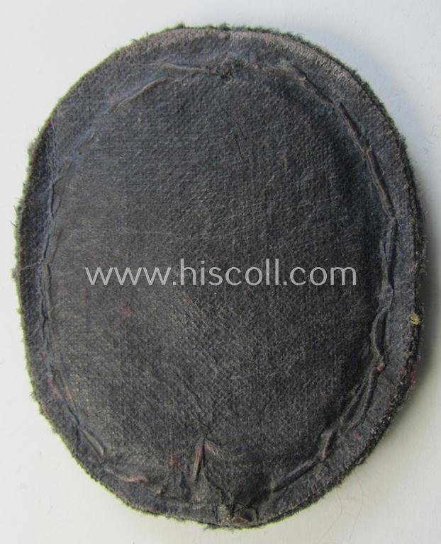 This a truly very attractive - and actually not that easily encountered! - WH (Luftwaffe) 'Fallschirmschützen-Abzeichen in Stoff' (or: cloth-based, paratroopers'-jump-badge) that is neatly machine-embroidered in multi-coloured- (and typical linnen-based-) thread and being of the neat, so-called: 'of-factory'-'padded version' and that comes in an overall very nice- (I deem issued albeit never used- nor tunic-attached- ie. 'virtually mint'-), condition. This particular example has great pronounced detail and is made more 'thicker' by the producing-company in order to closely resemble its metal-based counterparts. The piece is nicely 'backed' with black-coloured- paper as is more often encountered (which 'backing' is completely present as can be seen on the pictures). The badge just shows some age and/or staining simply caused by decades of storage only. These detailed cloth-based versions were preferred by the soldiers, NCOs and/or officers 'stationed in the field' for obvious reasons. Simply an attractive and fully 'text-book' example of a WH (Luftwaffe) 'Fallschirmschützen-Abzeichen in Stoff' that cannot be upgraded and that is I deem accordingly priced!