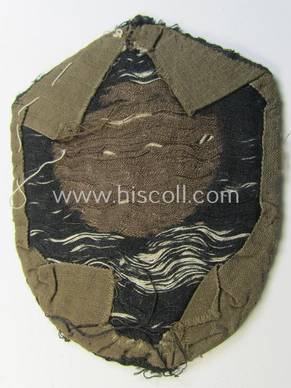 This is an attractive - and actually scarcely encountered! - female-related, enlisted- (ie. NCO-) pattern, so-called: 'RADwJ'-sleeve-badge (ie. 'Abzeichen des Reichsarbeitsdienst der weiblichen Jugend') being an example as executed in neat so-called: 'BeVo'-weave-pattern and that comes in an overall nice- (albeit surely used- and/or carefully tunic-removed- ie. once worn-), condition. The badge is neatly white- (ie. black-) coloured having a typical, brownish-coloured background and was intended for a female RADwJ-staff-member: it was clearly worn and shows some minimal staining and was carefully trimmed and confectioned (as can be seen on the pictures). Of additional interest is, moreover, the fact that this example shows the (Roman-styled) numerals: 'IX' (signifying that it was an example that was worn by a member of the 9th region ie. department ie. 'Bezirk'). The badge is not maker-marked (as is more commonly encountered: most of the copied examples show a full and interwoven logo whereas this example is of course a garuanteed orginal and used example). It should be noted that excellent copies of these badges do exist: this is naturally a genuine-, period example that originated from a German private-household. Simply a neat - and truly scarcely encountered! - enlisted- (ie. NCO-) pattern RADwJ-related arm-badge!