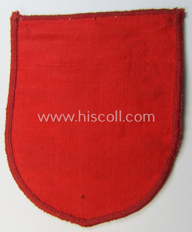 This is an attractive - and actually scarcely encountered! - D.A.F.- (ie. 'Deutsches Arbeitsfront') specialist-armbadge (ie. 'Tätigkeitsabzeichen') is executed in the neat 'BeVo'-weave pattern and was specifically intended for usage by an: 'Übungswart' (being some sort of instructor- ie. trainer) and that comes in an overall very nice- (albeit minimally used- ie. worn- and/or: I deem clearly tunic-removed-) condition. The badge on offer here - showing a swastika-sign surrounded by the (typical) D.A.F. 'Zahnrad'-sign ie. logo with below that the text: 'Übungswart' - is beautifully executed in so-called 'BeVo'-weave pattern and is backed with: bright-red-coloured- (and/or: linnen-based-) cloth (as can be seen on the pictures). The badge - which measures 9,5 x 8,5 cms. - is just minimally worn and shows some normal wear, age and/or staining. Simply an attractive and most certainly scarcely encountered D.A.F.-related arm-badge ie. 'Tätigkeitsabzeichen' that is accordingly priced!