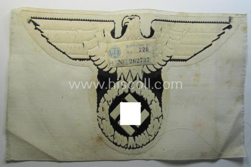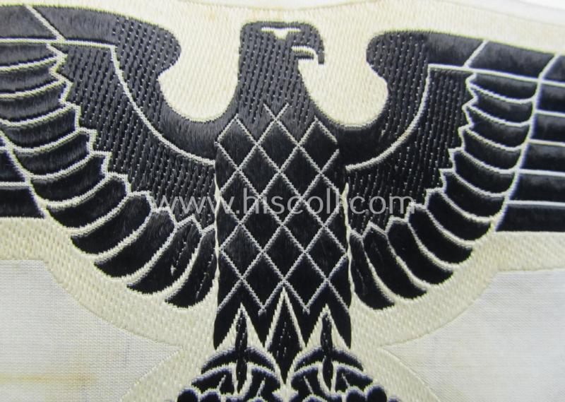This is a very attractive - and fairly large-sized and actually not that often seen! - example of a typical linnen-based N.S.D.A.P.-related sport-shirt badge (ie. 'Brustabzeichen für Sportanzug') as was executed in the neat 'BeVo-weave pattern and that still retains its period-attached 'RzM'-etiket and that comes in an overall very nice- (ie. I deem simply never shirt-attached- ie. 'virtually mint', condition. These decorative badges were worn on the specific N.S.D.A.P.-party-related, linnen-based sport-shirts and/or related garments. The patch on offer here is of the larger-sized version (measuring: 20 x 12,5 cms.) and is neatly executed in the so-called 'BeVo'-weave technique. The piece - which shows an interwoven, black-coloured (and right-facing!) national eagle-device on a beige-white-coloured- and/or linnen-based background - is just a tiny bit wrinkled and shows some minor aging ie. staining caused by regular usage and/or storage for decades. Simply a nice opportunity to acquire a neat N.S.D.A.P.-related sport-shirt badge for a competitive price!