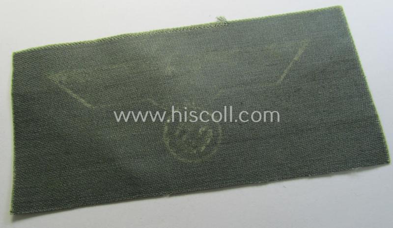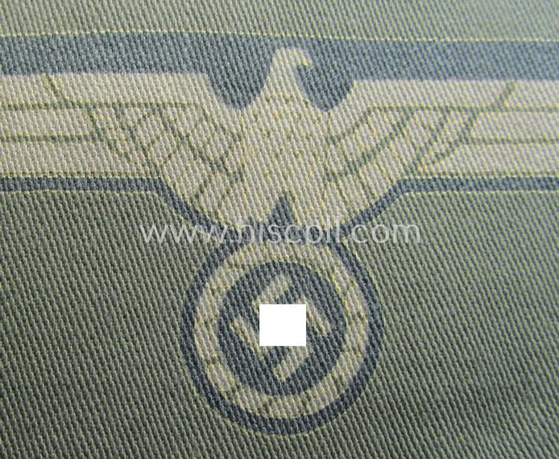 This is a very attractive - and actually fairly rarely encountered! - WH (Heeres) breasteagle (ie. 'Brustadler für Mannschaften u. Unteroffiziere des Heeres') being of the 'last-ditch'- (ie. later-war-period-) and entirely 'printed'-pattern and that comes in an overall very nice- (ie. simply never used- ie. 'virtually mint- ie. unissued'-), condition. These printed versions of the 'standard-pattern' army-type breast-eagle were introduced in late 1944 ie. the beginning of 1945 and saw only limited usage. They are sometimes found on the - battle-dress like-model-, so-called: '1944-type' Heeres tunics. I personally have also seen this printed-type eagles being (originally!) attached to such a late-war M44-tunic. The piece on offer here comes in a never confectioned format and is just a tiny bit stained and/or does show some minimal wrinkled areas (simply caused by handling over the years). The piece came as 'straightly cut-out' of a larger sheet (as can be seen on the pictures). Simply a truly rarely encountered 'printed' WH (Heeres) breast-eagle that comes in a never used- ie. 'virtually mint- ie. unissued'- condition!