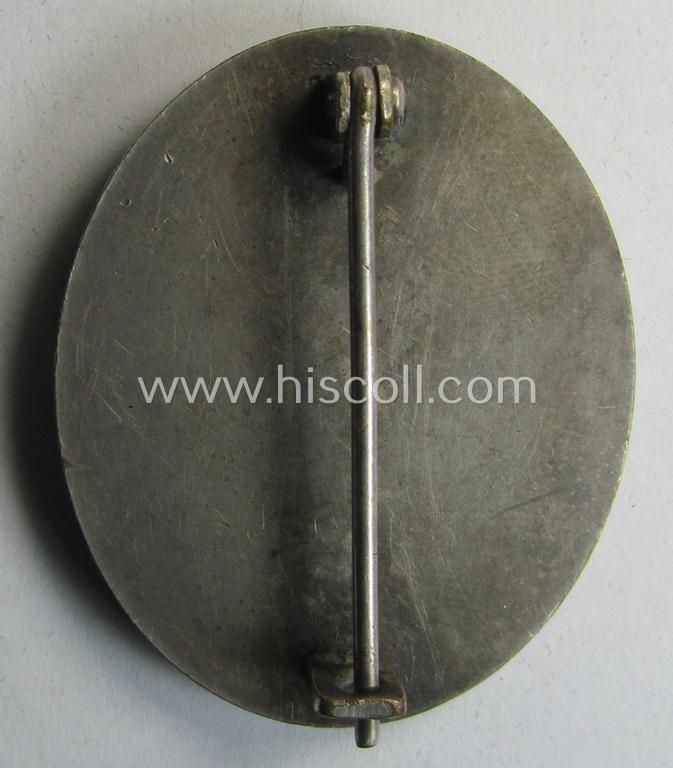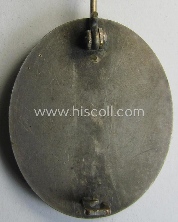 The truly attractive - and fairly luxuriously styled! - silver-class wound-badge (or: 'Verwundeten-Abzeichen in Silber') is executed in neat and/or minimally shiny (ie. somewhat tarnished), so-called: 'Buntmetall' and does show some obvious usage and/or wear (as can be seen on the pictures). The badge - which is naturally non-magnetic - comes mounted onto its fully functional (thin-shaped- and totally unaltered) pin (which is of course fully functional) and comes mounted onto its functional and dito pristine catch (as can be seen on the pictures). The badge is most certainly never cleaned and retains truly most of its silver-toned finish. It is - as stated above - a non-marked example that is I deem an early-period- (and truly quality-procuded!) piece that was produced by a (by me) unidentified maker. Simply an attractive - and with certainty desirable! - early-war-period, silver-class WB that is priced according to its overall nice- and/or untouched, condition!