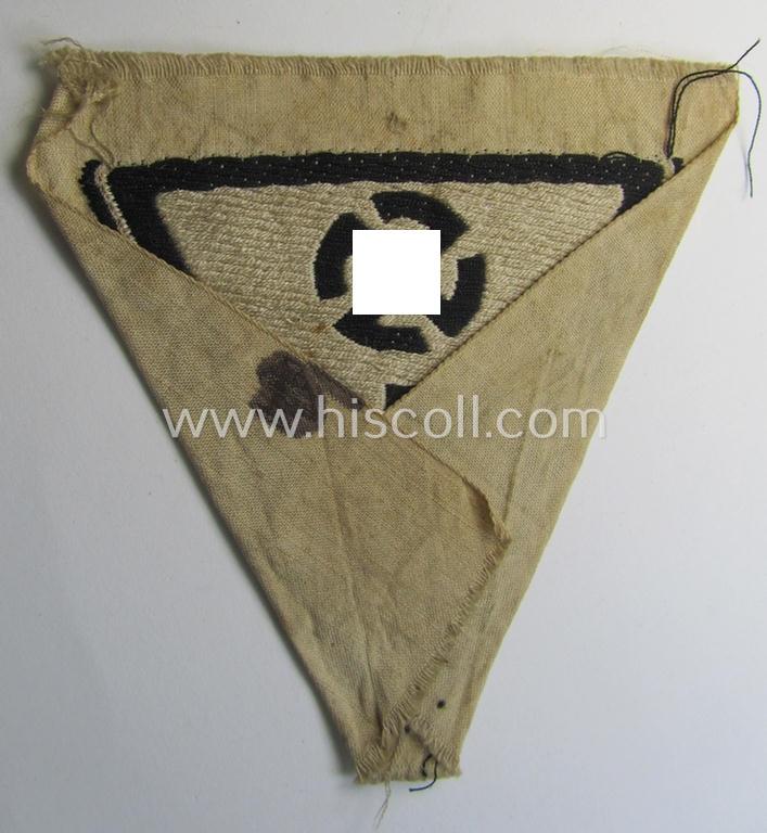 This is an attractive example of a linnen-based sport-shirt badge as was specifically intended for usage by members serving within the: 'Deutches Frauenwerk' (or: 'DFW') being a 'virtually mint'- (and/or most certainly never mounted) example that comes in a wonderful condition, overall. The neat patch - depicting a 'rounded swastika'-symbol and so-called: 'life'-rune-sign - is of the 'variant'-pattern comes in a just folded condition and shows some minor staining (ie. wrinkles) but has no damage whatsoever. The - somewhat larger- (ie. 11 x 10 cms.) sized - patch is one of the more difficult to encounter womens' sports'-related patches. Hard to find a better preserved example for a more interesting price!