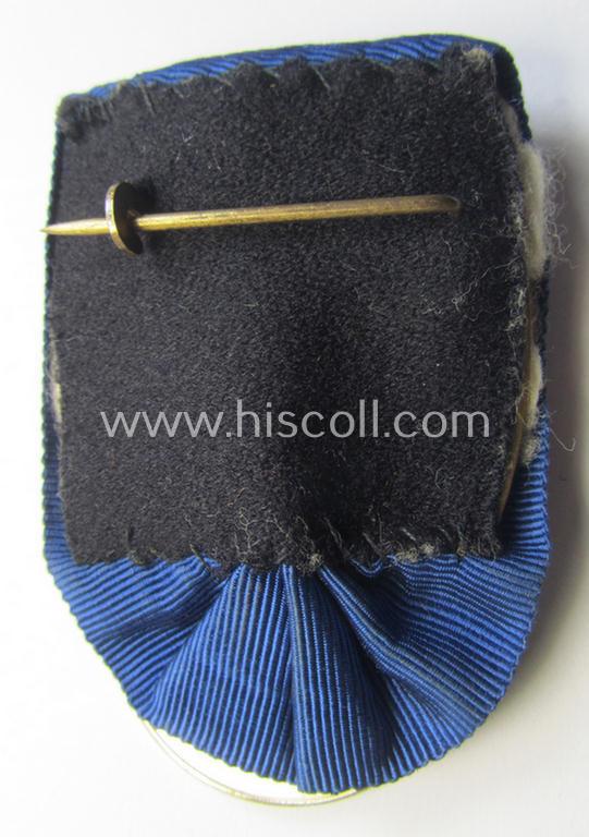 This is an attractive - and I deem only minimally used! - example of a bright- (ie. 'frosted') silver-toned WH (Luftwaffe) so-called: 'Einzelspange' (or: single-pieced medal-bar) showing a detailed: 'WH-Dienstauszeichnung 4. Stufe' (as was intended for 4 years of loyal-service) and that has a neat and pronounced (regular-sized- and neatly 'down-tailed'-modelled!) WH (Luftwaffe) eagle-device period-attached and that comes mounted onto its confectioned, darker-blue- (ie. cornflower-blue-) coloured ribbon as issued. The detail on this example is still extraordinary: it has - I deem - never been cleaned nor polished and has an attractive and somewhat 'frosted'- (ie. minimally tarnished) age-patina. The medal is 'mounted' onto a clasp (with functional pin/catch-set-up) as was intended for wearing this example on a 'going-out'- ie. dress-tunic or 'Waffenrock'. This example truly retains gorgeous details and has a great ie. only minimally darkened- ie. tarnished (ie. dirty) age-patina: it retains most of its fairly 'glossy'- and/or: silver-toned finish (and does show some minimal rust-staining). It is nicely 'backed' with a piece of (typical) black-coloured wool and comes mounted onto a chrome-steel-based 'backing-plate' as is more often seen. The darker-blue-coloured ribbon shows only minimal usage and/or staining. Hard to find a more attractive WH (Luftwaffe) example that comes mounted as an: 'Einzelspange'!