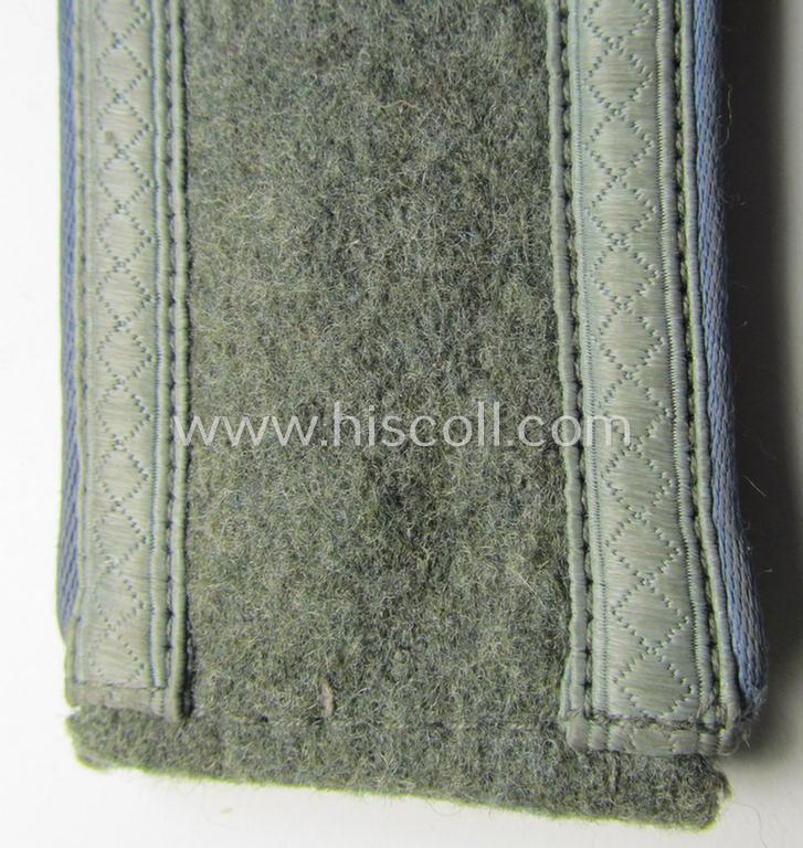 This is an attractive - albeit regrettably single! - (I deem) early- ie. mid-war-period, so-called: 'M40 o. M43'-pattern, WH (Heeres) NCO-type shoulderstrap as was piped in the light-blue- (ie. 'kornblumenblauer'-) coloured branchcolour as was intended for usage by an: 'Unteroffizier der Nachschub-Truppen' (or: junior-sergeant who served within the army transport-troops) and that comes in an overall very nice- (albeit moderately used- ie. just minimally worn-), condition. The shoulderstrap - which measures approximately 11,2 cms. in length as more often seen - has the neat 'silk-like'-type piping attached (as is more encountered with these early- ie. mid-war-period shoulderstraps). The shoulderstrap - which originates from a larger cloth- and insignia-collection I recently acquired for the web-site - shows the bluish-grey-toned (ie. truly sub-dued) NCO-braid attached and comes naturally mounted onto its functional tongue (as can be noticed on the pictures). Simply an attractive - and/or fully 'text-book'!, M40- ie. 43-pattern NCO-type 'Nachschub'-shoulderstrap that was intended for usage by an: 'Unteroffizier der Nachschub-Truppen'!
