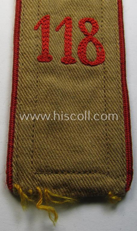 This is an attractive - albeit regrettably single but nevertheless not that easily found! - early-pattern, so-called: 'Allgemeine-HJ' (ie. general 'Hitlerjugend') shoulderstrap as was intended for usage - and clearly worn! - by a: 'Hitlerjunge' who was attached to the: 'Bann 118' (Bann 118 = 'Bann Worms' in the 'Gebiet West Hessen-Nassau') and that comes in an overall nice- (I deem just moderately used- ie. carefully tunic- or shirt-removed-), condition. The strap - which is executed in typical, beige-tan-coloured linnen as to be expected - has the bright-red-coloured- (and rayon-based) piping attached and shows the machine-embroidered - by means of 'Kurbelstickerei' (and/or equally coloured) so-called: '118'-numerals (ie. 'Ziffern'). The strap never had a tongue attached and comes as found and/or issued: it is of 'sewn-in'-pattern (and was also used as such). The strap - that shows a period-attached 'RzM'-etiket - measures 11,2 cms. in length and does show some minimal age ie. staining simply caused by minimal wear and/or decades of storage only. It should be noted that all 'cyphered' (ie. 'Hitlerjugend') shoulderstraps can easily be graded 'scarce' even more so when they are of the desirable early-pattern!