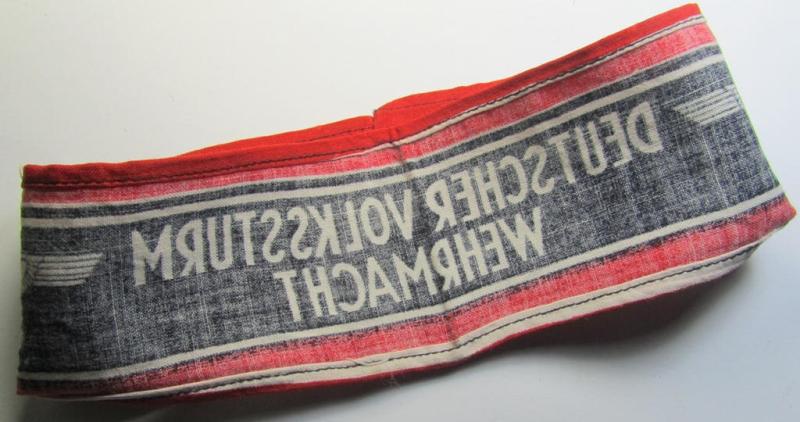 Superb, typically printed- and/or later-war-period, bright-red- and/or black-coloured so-called: 'Deutscher Volkssturm'-armband (ie. 'Armbinde') that comes in an overall very nice- (I deem hardly used- nor worn- ie. 'virtually mint'-), condition