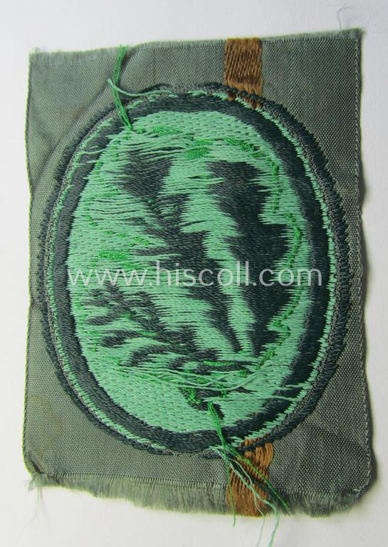 This is a neat example of a WH (Heeres) enlisted-mens'- (ie. NCO-) type, so-called: 'Jäger'-armpatch being a (typical) 'BeVo'-woven example as was executed on field-grey-coloured linnen as was intended for usage by the: 'Jäger-Truppen' and that comes in an overall very nice- (ie. simply never used- nor worn- ie. 'virtually mint-/unissued'-, condition. These attractive 'Jäger'-armpatches (as was intended for usage by the: 'Jäger-Truppen'- or: rifle-troops throughout the war) are showing three oakleaves on a darker-green-coloured background and were worn on the right upper-sleeve by the troops that were attached to the various 'Jäger'- (ie. rifle-) regiments (being some sort of mid-war-period, mountain-troop-related, infantry-units). The piece on offer here came 'as straightly cut-of the role' and will be hard to be upgraded: it is just a tiny bit wrinkled. Simply a nice occasion to acquire a neat (and of course genuine!) Heeres-'Jäger'-armpatch for an interesting price!