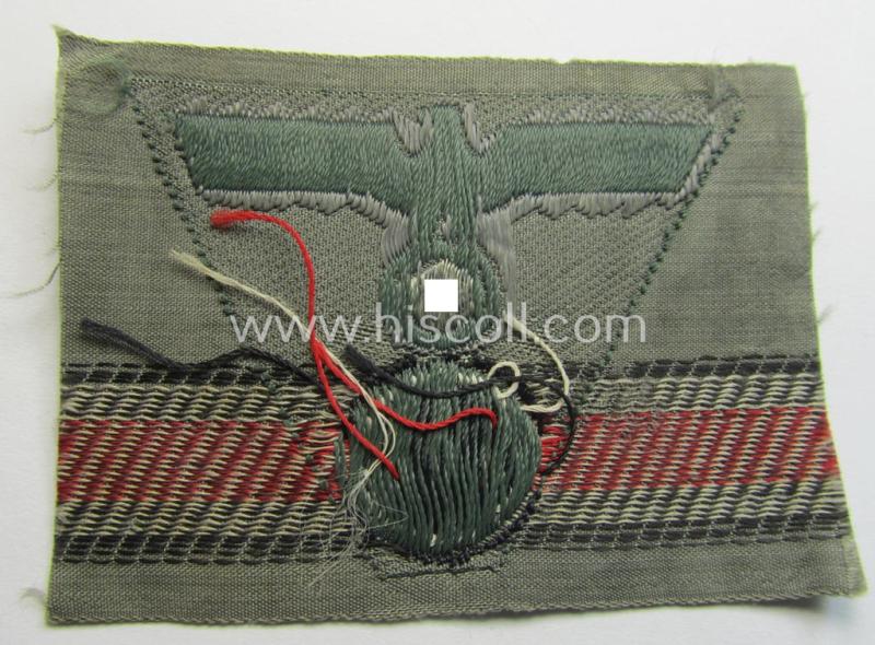 This is a neat example of the 'standard-issue'-type, WH (Heeres) so-called: 'M43-pattern'-cap-eagle/cocarde (ie. cap-trapezoid) as was specifically produced for usage on the so-called: 'M-43'-model field-caps (ie. 'Einheitsfeldmützen') and that comes in a simply never used- (ie. 'virtually mint- ie. unissued'-), condition. The piece is executed in the so-called: 'BeVo'-weave-pattern and was simply never confectioned nor cap-attached and comes as 'carefully cut-off the role': it comes in an overall very nice- ie. simply never used- nor mounted ie. 'virtually mint- ie. unissued', condition. The piece is executed in bluish-grey-coloured linnen on a field-grey-coloured (and/or also linnen-based) background and does show some minimal staining ie. storage-age only (as can be seen on the pictures). Simply a neat occasion to aquire an attractive and 'BeVo'-woven cap-trapezoid for a competitive price!