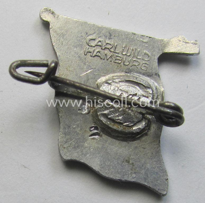 Commemorative - and not that often seen! - (I deem) quite early-period, aluminium-based, N.S.D.A.P.-related lapel-pin example depicting a swastika-flag being a maker- (ie. 'Carl Wild'-) marked example