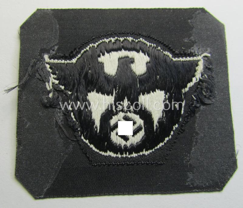 The attractive insignia-piece on offer here is neatly executed in so-called: 'BeVo'-weave-style (and is executed in white-coloured linnen onto a black-coloured- and linnen-based background: it was simply never cap-attached and comes in a 'virtually mint- ie. unissued', condition. As such, it can naturally easily be mounted onto an enlisted-mens'- (ie. NCO-) type Polizei- (ie. 'SS-Polizei'-) side-cap (ie. 'Schiffchen für Mannschaften u. Unterführer') (or can even be used for an: 'M43'-type-cap ie. 'Einheitsfeldmütze'). This - actually scarely encountered! - (side)cap-eagle is executed in the so-called: 'BeVo'-weave style and is executed in white-toned linnen on a (typical) black-coloured background as to be expected. These cap-eagles were presumably intended for usage and have truly stunning detail (as can be seen on the pictures) and simply cannot be upgraded: the piece comes 'as straightly cut-off the role' and was naturally never folded nor confectioned. Moreover, does it show some minimal glue-remains on its back simply caused by having glued into an album or scrapbook once (as can be noticed on the pictures). This example originates from a 'Musterbuch' (or: sample-book) that was period-compiled by the producing-company 'Offermann' as was based in the town of Ratingen. Simply a great opportunity to acquire a neat Polizei- (ie. 'SS-Polizei') 'BeVo'-woven-style, enlisted-mens'- (ie. NCO-) pattern cap-eagle as was executed in 'BeVo'-weave-style!