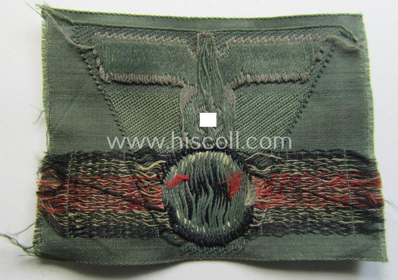This is a neat example of the 'standard-issue'-type, WH (Heeres) so-called: 'M43-pattern'-cap-eagle/cocarde (ie. cap-trapezoid) as was specifically produced for usage on the so-called: 'M-43'-model field-caps (ie. 'Einheitsfeldmützen') and that comes in a simply never used- (ie. 'virtually mint- ie. unissued'-), condition. The piece is executed in the so-called: 'BeVo'-weave-pattern and was simply never confectioned nor cap-attached and comes as 'carefully cut-off the role': it comes in an overall very nice- ie. simply never used- nor mounted ie. 'virtually mint- ie. unissued', condition. The piece is executed in bluish-grey-coloured linnen on a field-grey-coloured (and/or also linnen-based) background and does show some minimal staining ie. storage-age only (as can be seen on the pictures). Simply a neat occasion to aquire an attractive and 'BeVo'-woven cap-trapezoid for a competitive price!