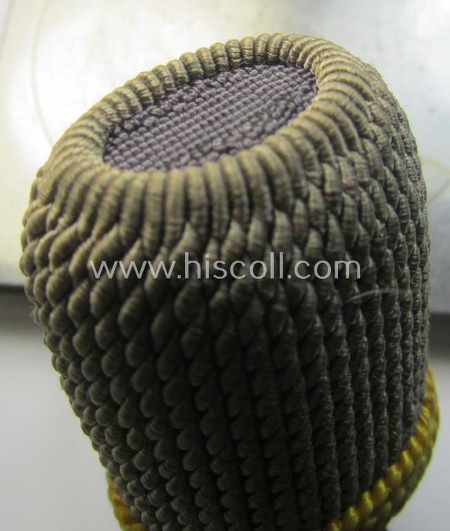 This is a truly attractive example of a bright-yellow- and white- (ie. greyish-silver-) coloured, enlisted-mens'- (ie. NCO-) type side-arm knot (ie. 'Portepee' ie.: 'Troddel') as was intended for usage onto the various WH-bayonets and that comes in an overall very nice- (I deem 'virtually mint- ie. unissued'- and/or most certainly never 'mounted'-), condition. These NCO-type side-arm knots (ie. 'Portepee' or: 'Troddel') were specifically intended for usage on the K98 bajonets (ie. their leather bayonet-frogs) and were worn by the various troops like the: 'Unteroffiziere' (ie. NCO-usage). The various (branch)colours used denoted a specific regiment ie. bataillon. The piece on offer here comes mounted onto a (greyish-coloured) and typical leather-based 'strap' and shows some minimal storage-age only and comes still folded as issued (as can be seen on the photos) and is void of any damage and is of course still functional. The piece was recently uncovered at a German private-household and was never before in collectors'-hands. Simply an attractive example of a 'standard-issue'-type WH-side-arm knot (ie. 'Portepee' ie.: 'Troddel') that is with certainty accordingly priced!
