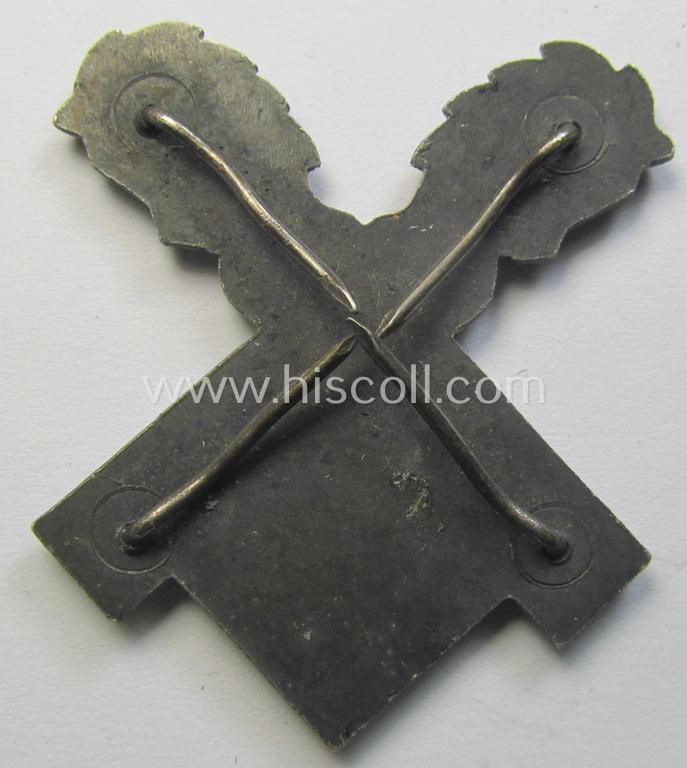 This is an attractive example of an - actually scarcely encountered! - RAD (or: 'Reichsarbeitsdienst') so-called: 'Traditions-Mützenabzeichen' as was specifically intended for (and with certainty worn by) a member who served within the region: 'Arbeitsgau XV' (being situated in the province Niedersachsen-Ost) and that comes in an overall nice- (albeit moderately used ie. cap-removed-) condition. The metal badge (as executed in silvered- and/or molded 'Buntmetall' as is more ofen encountered) depicts two crossed horse-heads with below a swastika-sign. The badge retains all its four prongs (for attachment to the cap) which are once bent but that are naturally still functional. A similar cap-badge is also figured in the Heering-Hüsken lapel-pin-catalogue, wherein it is given a unique reference-number (3805JG) and wherein it is given an estimated value of 150 Eu. The badge on offer here was I deem never cleaned nor polished: it still retains a very nice- and/or minimally tarnished age-patina. Simply an attractive and actually not that often encountered (semi-official) RAD-'Traditions-Mützenabzeichen' that is with certainty accordingly priced!