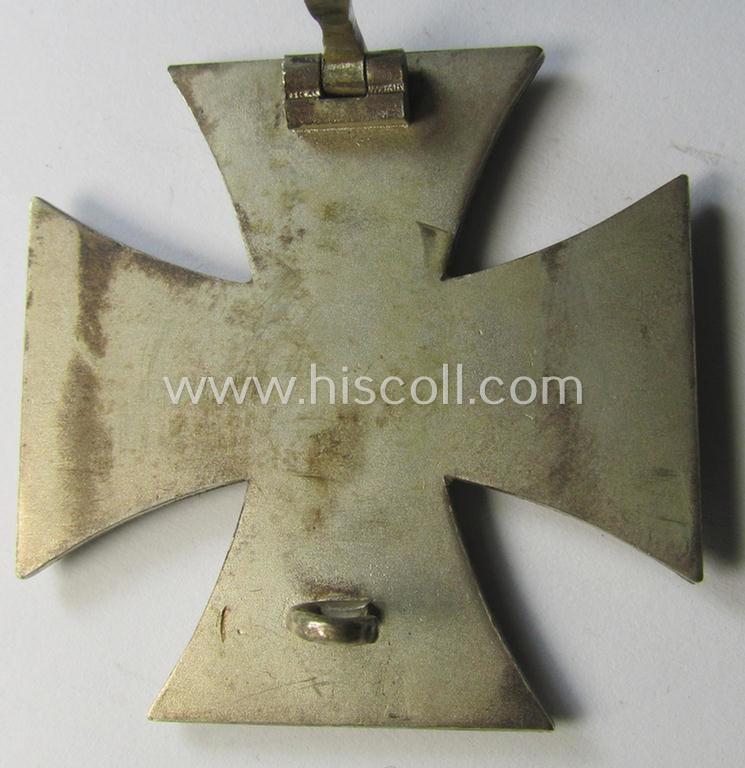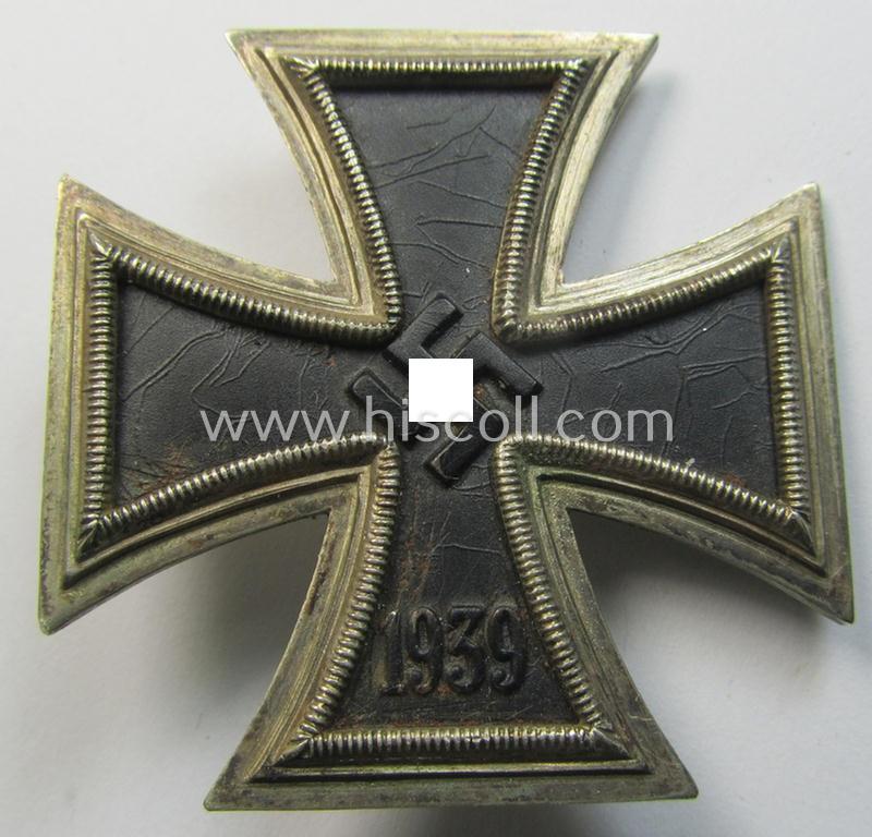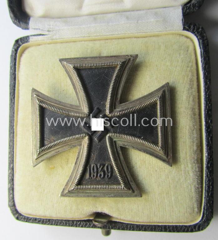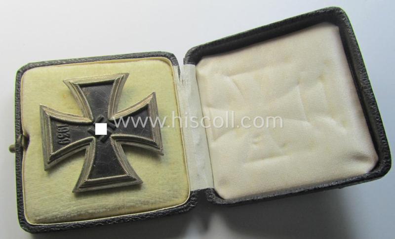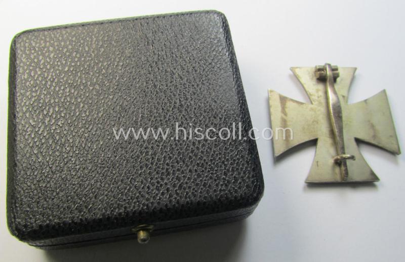 This is a truly attractive - and I deem just moderately worn- and/or used - example of an: 'Eisernes Kreuz 1. Klasse' (or: Iron Cross 1st class) being a detailed and non-maker-marked example as was (I deem) produced by the desirable maker (ie. 'Hersteller') named: 'Friedrich Orth' as was based in the town of Wien (ie. Vienna) and that came stored in its original, simulated leather-based- (and fairly luxuriously styled!) etui as issued and/or recently found and that comes in an overall very nice- (surely issued and just moderately used- ie. worn-), condition. The magnetic cross - which is totally void of any makers'-designation - was with certainty never cleaned and has a nice and/or attractive age-patina: it retains some of its so-called: 'hochpolierte Kanten' (or: polished sides) and has a minimally darkened- (ie. hardly 'blackened'- ie. stained) finish (as can be seen on the pictures). The cross has a nicely preserved, black-finished (ie. somewhat 'satin-like'- ie. somewhat matted-) core: it is void of any damage nor paint-loss (as can be seen on the pictures). The piece is just a tiny bit dusty and/or stained but was never cleaned nor polished. The back of the cross is just a tiny bit stained (but was never cleaned nor polished). The (flute-shaped) pin and catch (ie. set-up) are naturally unaltered and/or fully functional. The etui comes also in a very fine and fully complete condition: the silver-rimmed cross that figures on the etui's top is in a very nice and undamaged condition whereas the yellowish-beige-coloured- and/or velvet-like interior is also present and in place: it is just a bit 'yellowed' by age (as can be seen on the pictures). The cross is (I deem) an evident specimen that was almost certainly produced by the Austrian maker: 'Friedrich Orth' as was based in the town of Wien (ie. 'Hersteller 15'): it has very nice and/or pronounced detail as to be expected for a cross by this desirable maker. The piece is (I deem) an early-war-period produced example something that can be corroborated by the presence of an early-type, silvered frame. The IC was recently found at a German private-household and was never before in collectors'-hands: it came together with the EKII-class that I offer under nr. 62291: both awards belonged to the same soldier who was awarded these, moderately used them and stored them for decades!