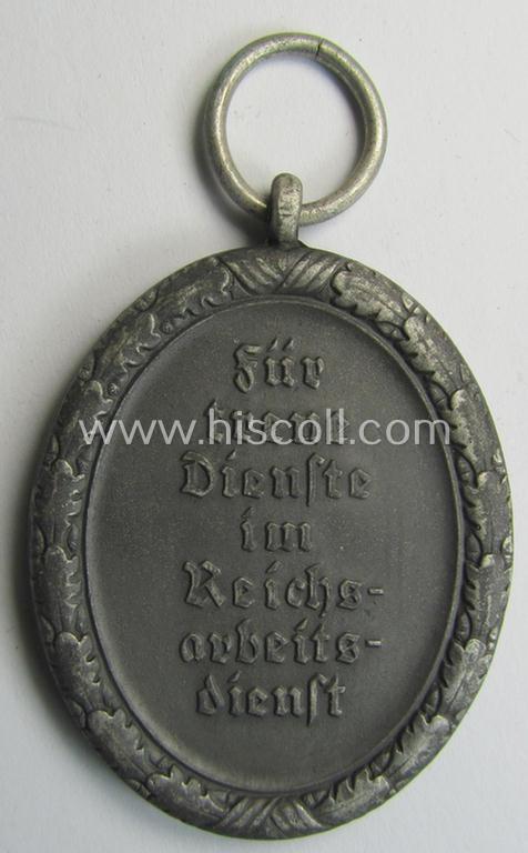 The attractive and fairly scarcely found 'Reichsarbeitsdienst der weiblichen Jugend' (or: RADwJ) service-award - being of the 'regular-weight'- (ie. zinc- or 'Feinzink'-based) version - truly retains nice details and has a darkened- (ie. somewhat tarnished) age-patina: it has, however, lost most (ie. all) of its bright-silver-toned finish (which has faded-away over the years ie. has 'migriert') and has most certainly never been cleaned nor polished (as can be seen on the pictures). The piece came mounted onto its typical period, broad-sized, shortened and/or cornflower-blue-coloured ribbon (ie. 'Bandabschnitt') as issued and/or presumably worn. It should be noted that these attractive, female-related 'RADwJ-Dienstauszeichnungen' are actually not that easily found and can be graded 'fairly scarce'. Simply an attractive example of this: 'RAD Dienstauszeichnung für weibliche Jugend 3. Stufe in Silber' that is I deem accordingly priced!