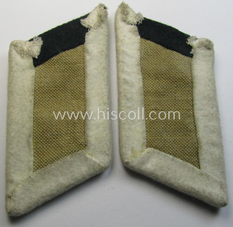 This is an attractive - and actually not that easily found! - pair of WH (Heeres) officers'-type collar-tabs (ie. 'Kragenspiegel für Offiziere des Heeres') as nicely executed in detailed hand-embroidery and that is piped in the neat darker-green- (ie. 'grüner'-) coloured branchcolour (and showing an additionally-added white-coloured- and woolen-based piping attached) as was specifically intended for usage by an (administrative) officer who served as an: 'Beambter o. Offizier des gehobenen Dienstes' and that comes in an overall very nice- (I deem presumably issued- and/or worn- ie. once tunic-attached-), condition. The pair - which is backed with yellowish-coloured- and/or typical 'Buckram'-based material as is more often observed - is just a tiny bit stained due to moderate wear and/or decades of storage only. Simply an attractive Wehrmacht 'Heeresverwaltung'-related, officers'-pattern 'Kragenspiegel'-pair that comes in a wonderful condition: hard to find a more attractive and scarcely found collar-tab-pair for a more interesting price!