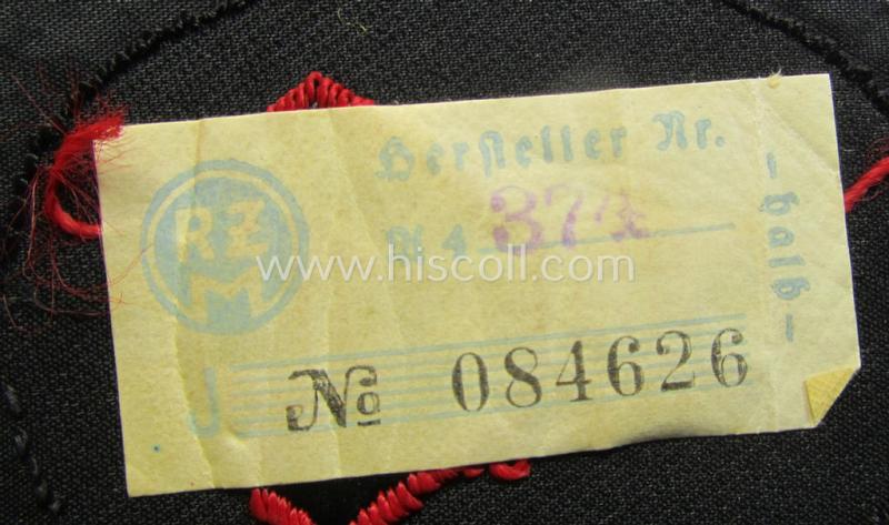 Superb - and never used- nor worn! - N.S.K.K.- (ie. 'National-Socialistisches Kraftfahr-Korps'-) related armbadge as was intended for an: 'N.S.K.K.-Sanitäts-Unterführer o. Mann' (ie. 'Feldscher') that still retains its 'RzM'-etiket