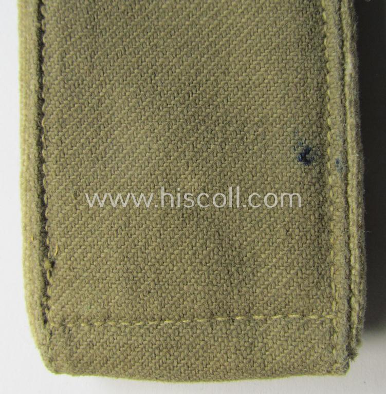This is a truly attractive - albeit regrettably single but nevertheless extremely rarely encountered! - WH (Heeres) 'tropical' (ie. I deem early-war-period- and truly DAK- or 'Deutsches Afrikakorps'-related), enlisted-mens'-type shoulderstrap as piped in the neat white- (ie. 'weisser'-) coloured branchcolour as was specifically intended for - and with certainty worn by! - a: 'Soldat der Flak-Artillerie-Truppen' (or: simple army-soldier who served within an army anti-aircraft unit) and that comes in an overall very nice- (albeit moderately used- ie. clearly worn-), condition. The neat shoulderstrap - which measures approximately 11,5 cms. in length - has the neat white- (ie. 'weisser'-) coloured and/or woolen-type piping attached: it comes mounted onto its functional tongue (as can be noticed on the pictures). The strap comes in a fully 'text-book' condition and has a 'earthen-brown'- ie. mustard-tan-coloured and/or linnen-based 'upperdeck'. The strap is also 'backed' with (early-pattern) greenish-tan-coloured wool, something that is more often encountered with genuine (and early-period!) tropical ie. DAK- (or 'Deutsches Afrikakorps'-) related shoulderstraps. The strap is (I deem) moderately worn (it is just somewhat faded ie. slightly stained caused by regular usage) and comes in a truly great condition, overall. It has never been cleaned and still shows some dirt ie. staining as caused by years of storage. The piece originates from a private-household in Germany and was never before in collectors'-hands. As most certainly known are most DAK-shoulderboards offered on todays' market copies: this is naturally a fine and 100% genuine, period piece for which I give a life-time garuantee (as always). Simply a superb - and as most certainly known very rarely encountered! - tropical-pattern, 'Heeres-Flak'-related EM-type shoulderstrap: too bad that it is only a single specimen!
