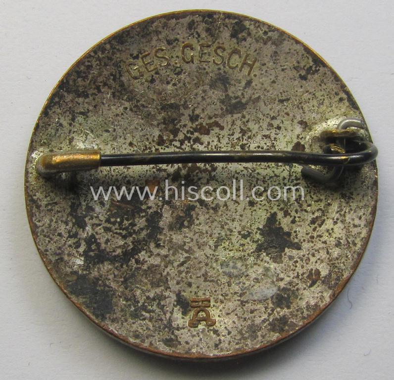 The attractive badge is - I deem - made-out of silver-coloured 'Buntmetall' and has an immaculate enamelled surface (truly no damages whatsoever can be noticed as can be seen on the pictures). The badge is a clearly maker- (ie. 'HA'- ie. 'Hermann Aurich') marked example that has - I deem - only minimally worn: it has never been cleaned nor polished (and is still a tiny bit stained and/or dirty) and comes of course mounted onto its functional- and/or unaltered pin- ie. pin/catch (-set-up). These badges were also worn by the Germanic volunteers. Next to the mentioned makers'-designation does the piece also show a clear 'Ges.Gesch.'-patent-pending-designation (as can be seen on the pictures). A similar example is also figured in the Heering-Hüsken lapel-pin-catalogue wherein it is given the unique reference-number: 5613XA. Simply an attractive DRK (ie. 'Deutsches Rotes Kreuz' or German Red Cross) so-called: 'Helferin'-badge that is accordingly priced!
